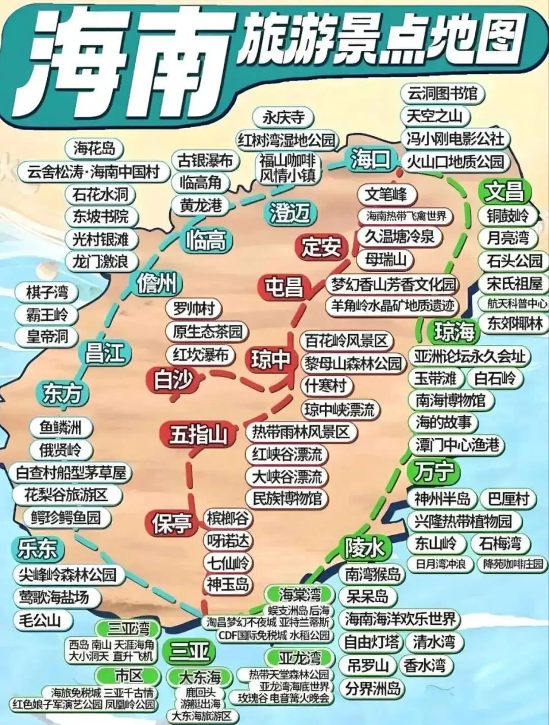 地貌风光:纯热带海岛地貌,以「碧海蓝天+椰林沙滩」为核心,亚龙湾、分界洲岛的珊瑚礁海岸绝美,中部五指山丘陵起伏,形成「滨海度假+山地雨林」的独特格局