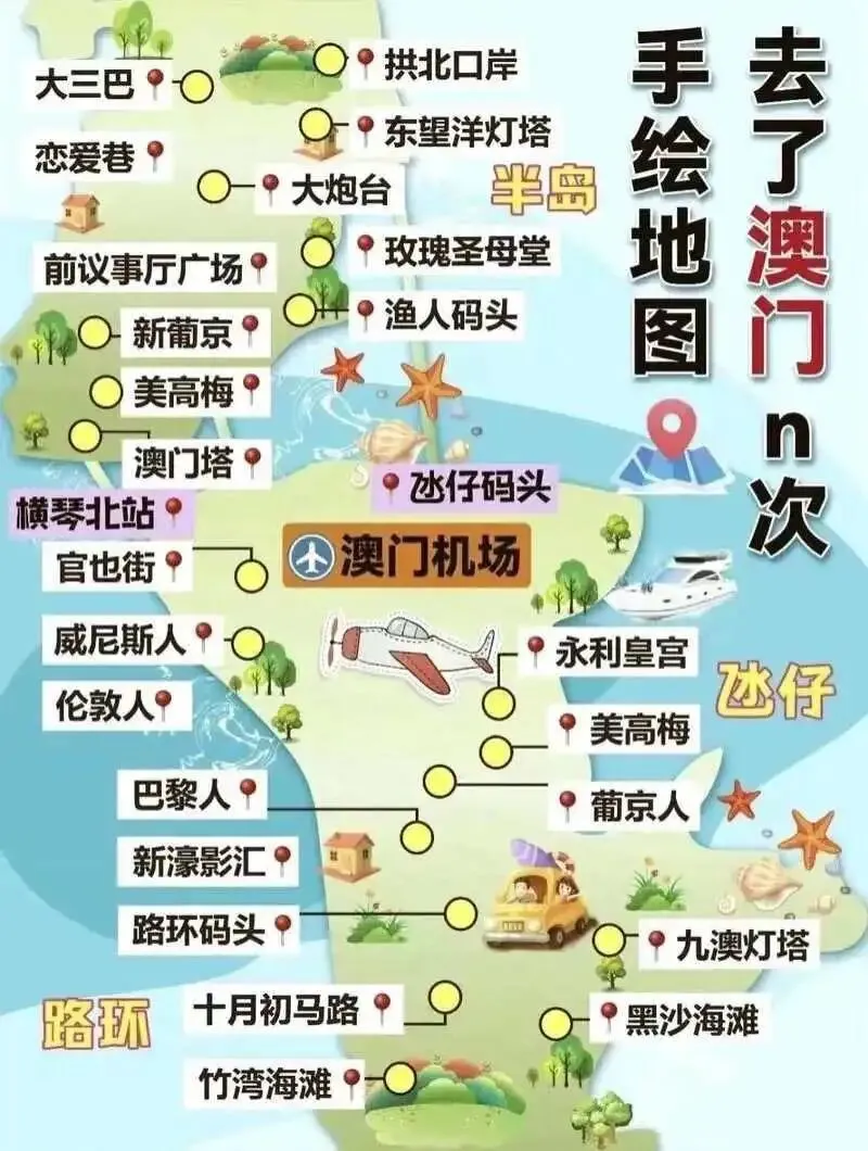 核心打卡地:大三巴牌坊、澳门塔、议事亭前地、氹仔官也街