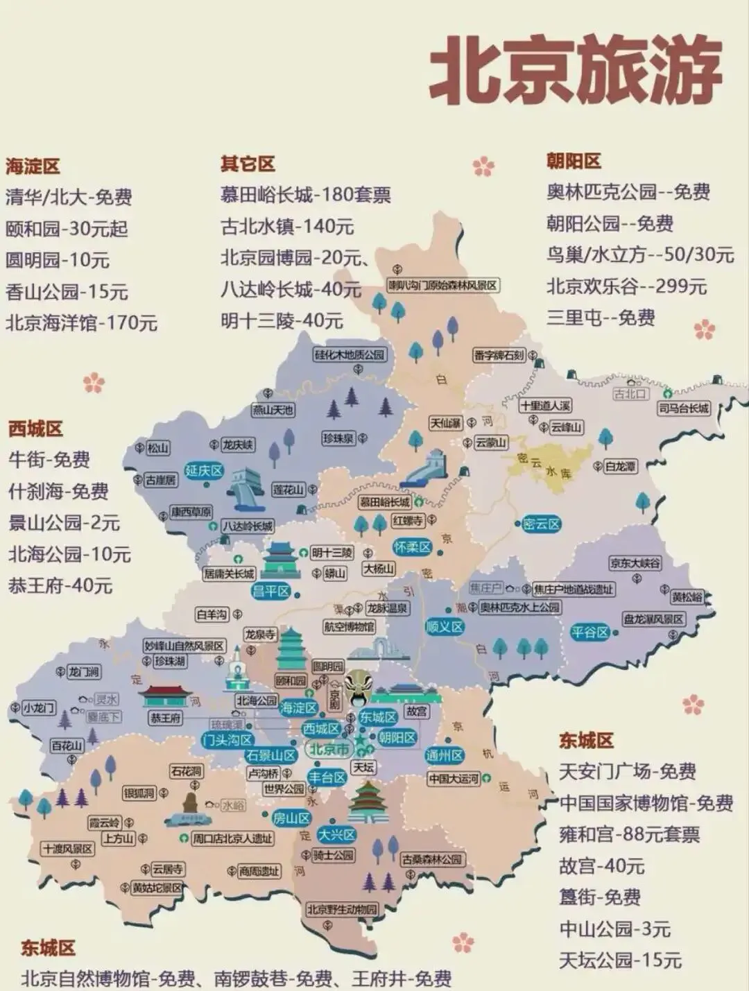 地貌风光:地处华北平原西北端,西靠西山(太行山脉余脉),北邻军都山,地势西北高、东南低,既有平原的开阔,又有山地的险峻,长城蜿蜒山间,形成「山水护京城」的独特地貌