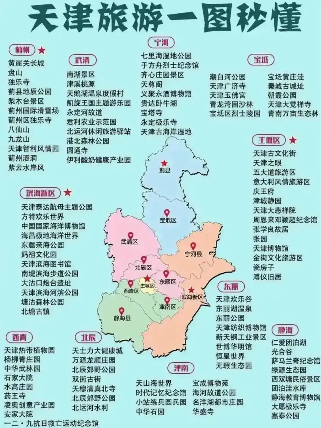 地貌风光:以华北平原为主,地势低平,河网密布(海河贯穿全城),东部濒临渤海,兼具「平原河港+滨海滩涂」地貌,风光温婉开阔
