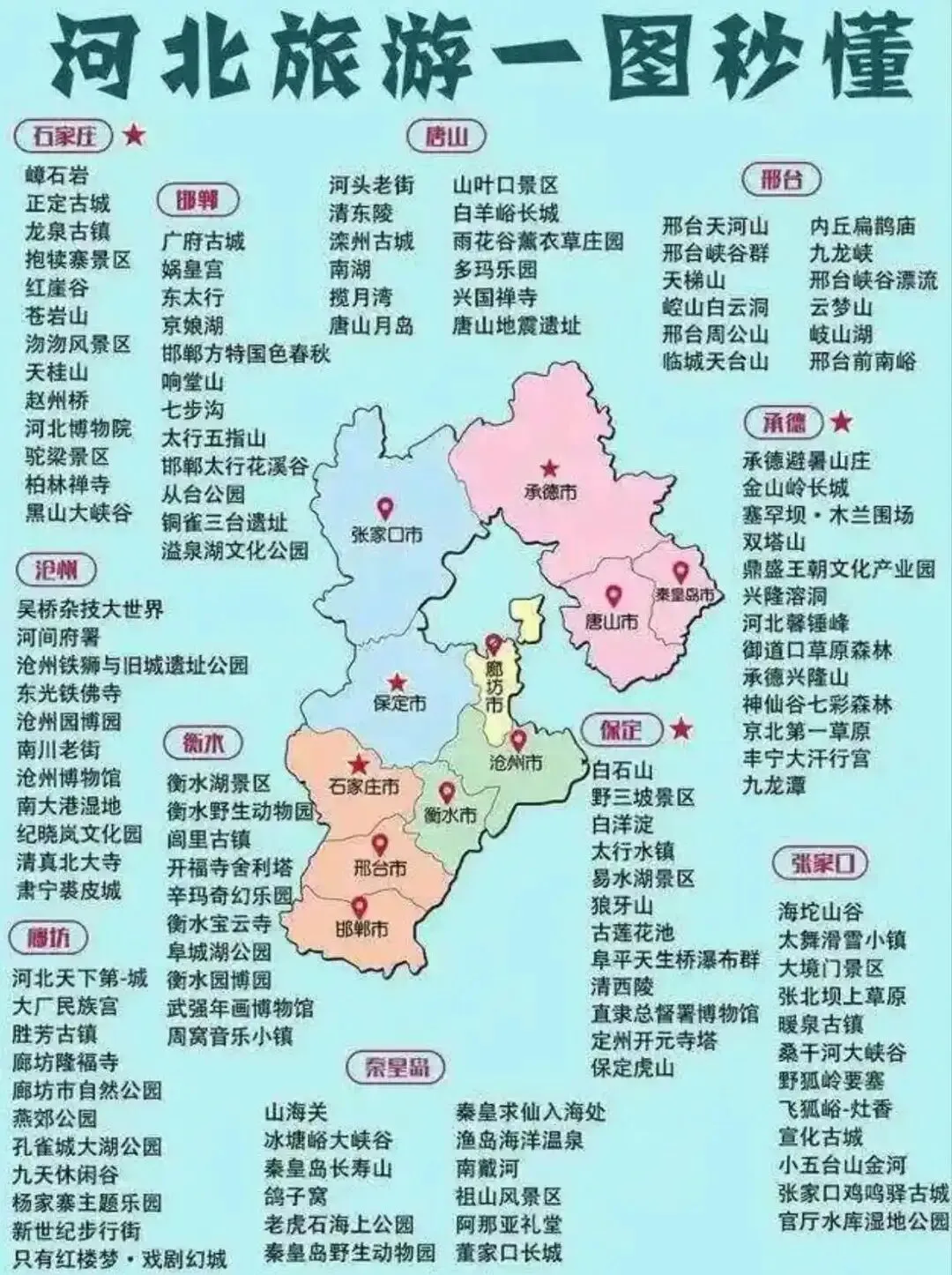 地貌风光:地貌多元,北部为燕山山脉(山海关矗立其间),西部为太行山脉(狼牙山、白石山),中部为华北平原,东北部濒临渤海,集山地、平原、滨海、关隘地貌于一体
