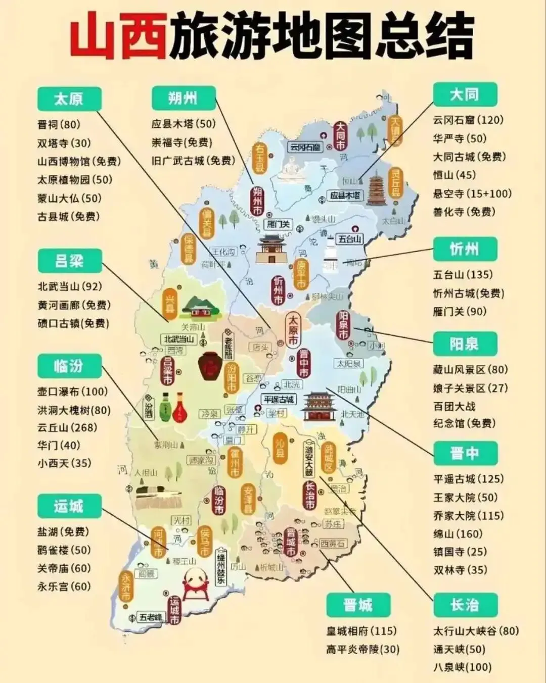 地貌风光:「表里山河」的典型代表,东部为太行山脉,西部为吕梁山脉,中部为汾河平原,山地丘陵占比超80%,黄土高原地貌广布,沟壑纵横间藏着古建奇观