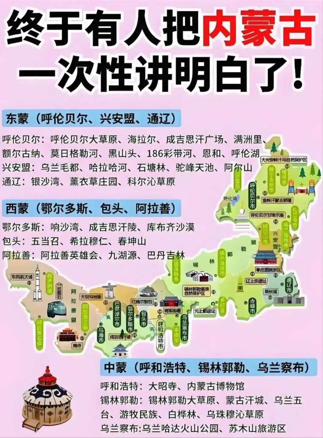 地貌风光:以「高原草原+沙漠戈壁」为核心,东部呼伦贝尔大草原地势开阔、水草丰美,西部为乌兰布和、巴丹吉林沙漠,兼具草原的辽阔与沙漠的苍茫,间杂少量丘陵与湿地