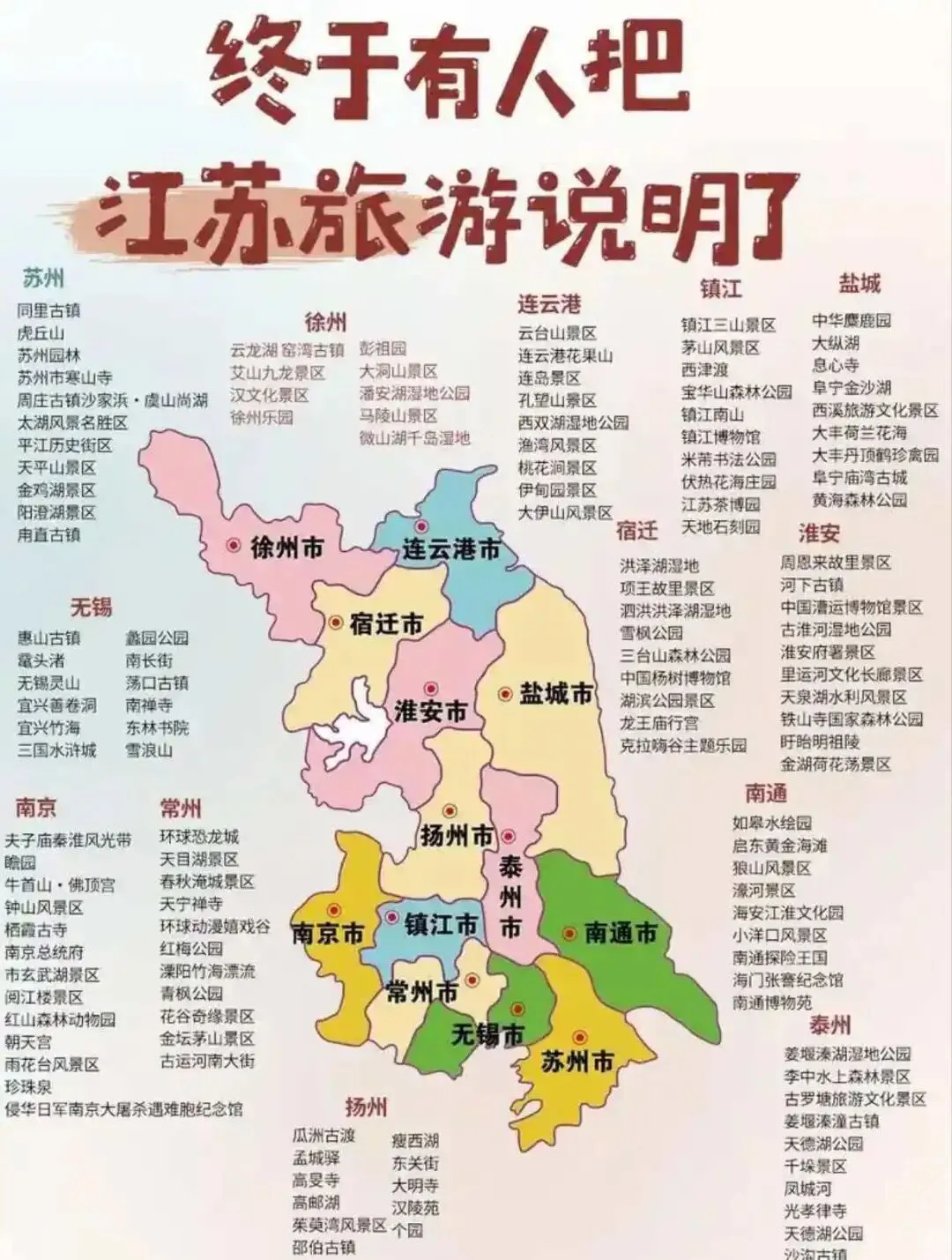地貌风光:以长江三角洲平原为核心,地势平坦开阔,河网纵横(长江、京杭大运河贯穿),太湖、洪泽湖等湖泊星罗棋布,是「江南水乡」地貌的核心代表,兼具湖光山色与平原风光