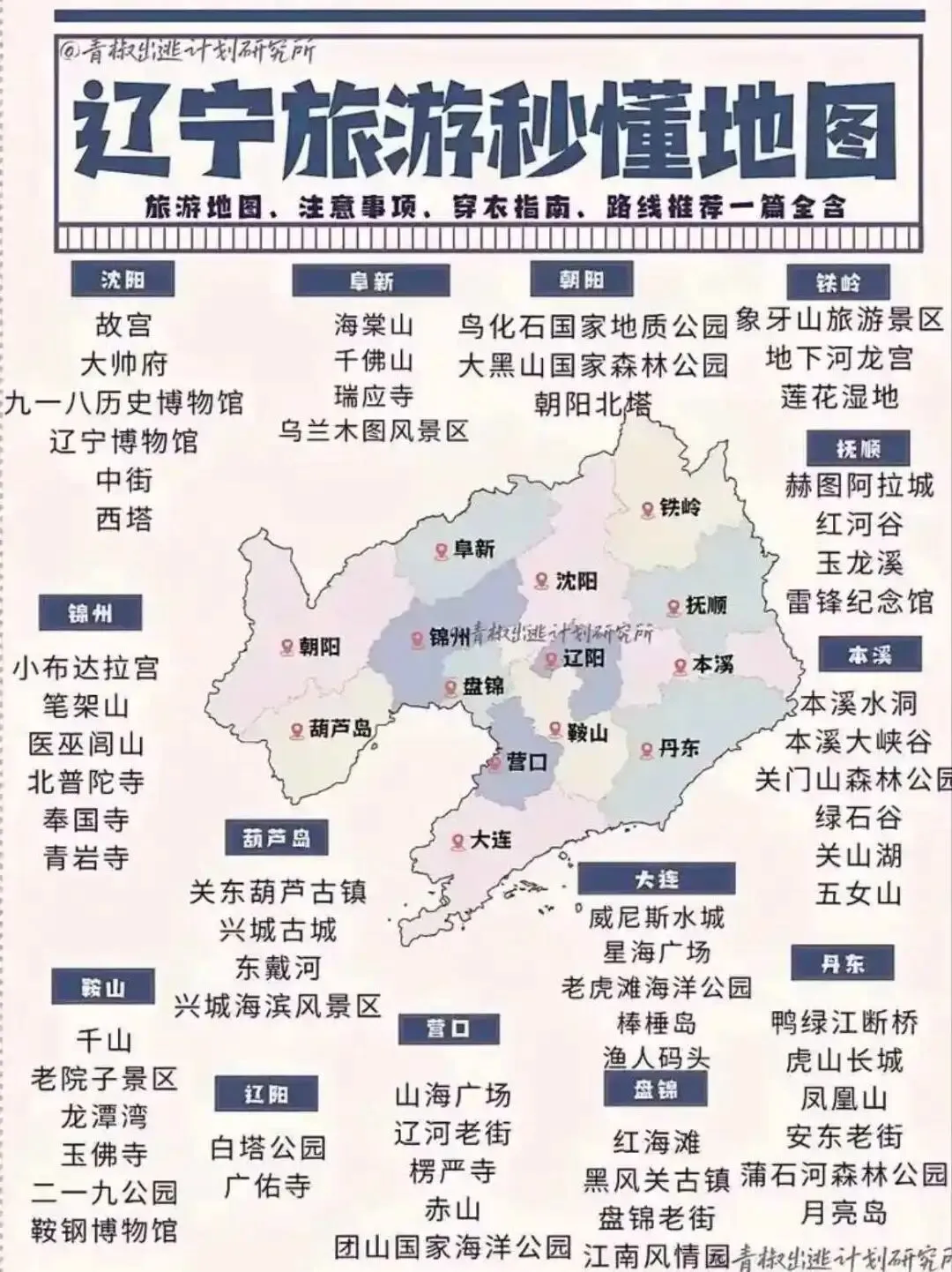 地貌风光:东部为长白山脉余脉(千山),中部为辽河平原,西部为辽西丘陵,南部濒临渤海、黄海,兼具「山地、平原、滨海」地貌,冬季冰雪覆盖,尽显北国风光
