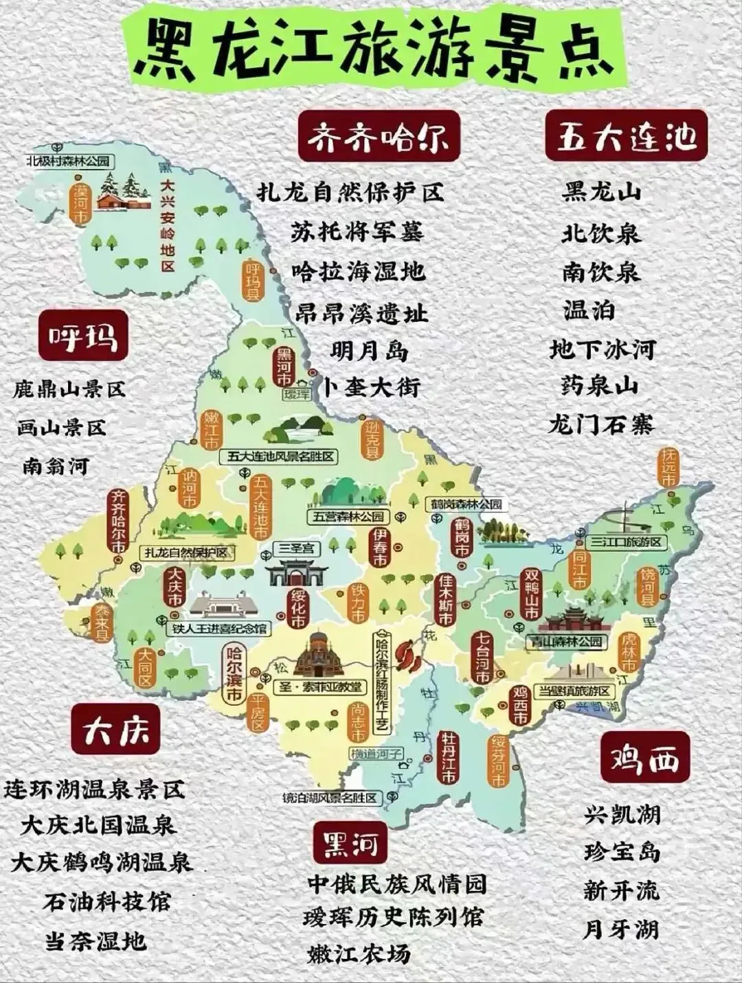 地貌风光:中国最北省份,以「平原+山地+冰雪」为核心,东部为长白山脉,中部为松嫩平原、三江平原(东北平原核心区),北部为大兴安岭山脉,冬季极寒,极光、冰雪童话地貌独树一帜