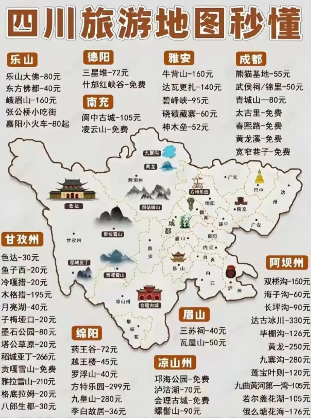 地貌风光:地貌极其多元,西部为青藏高原东缘(川西高原、横断山脉,雪山冰川广布),东部为四川盆地(成都平原),中部为丘陵,兼具「高原、雪山、平原、丘陵、峡谷」,堪称「中国地貌缩影」