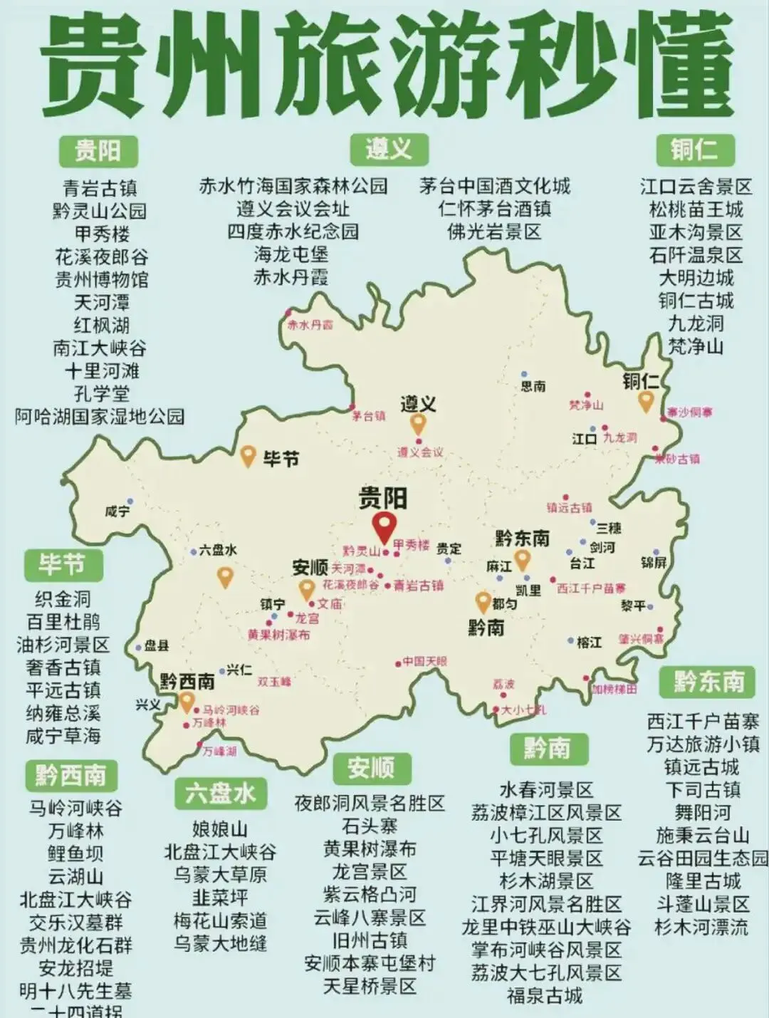 地貌风光:喀斯特王国」,喀斯特地貌占比超60%,峰林、溶洞、瀑布(黄果树)、天坑遍布,南部为云贵高原,北部为川黔山地,山水秘境众多,兼具奇秀与苍茫