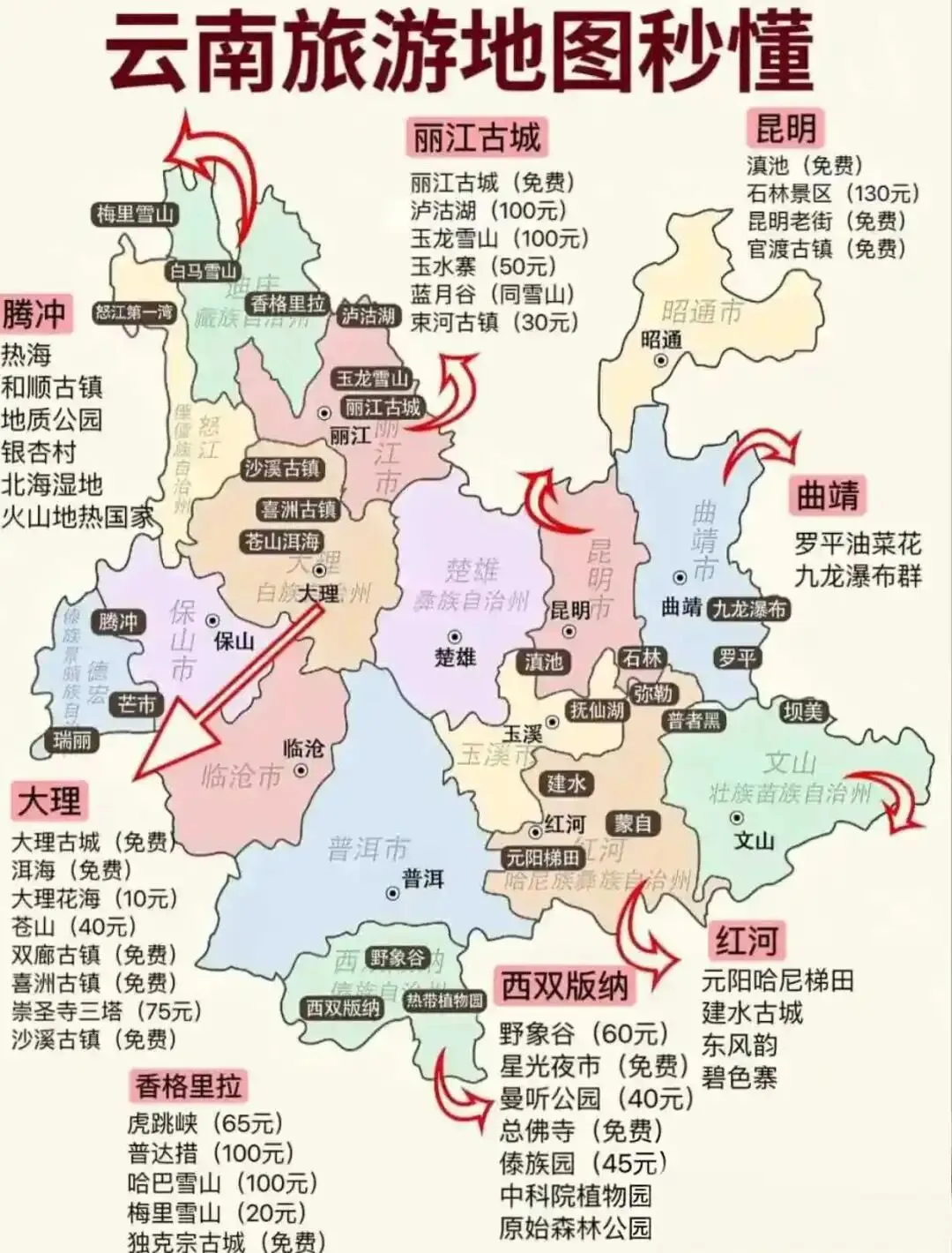 地貌风光:地处云贵高原西部,地貌立体多样,西部为横断山脉(玉龙雪山、梅里雪山),东部为云贵高原主体,南部为热带河谷(西双版纳),雪山、高原、湖泊、雨林、喀斯特齐聚,风光绝绝子