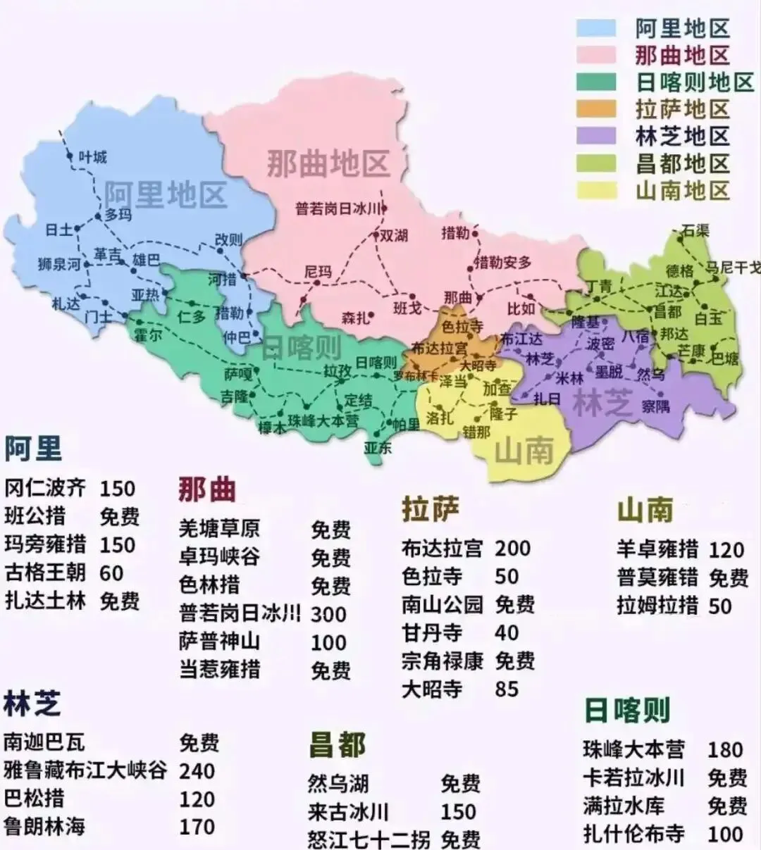 地貌风光:以「高原地貌」为核心,平均海拔4000米以上,青藏高原主体部分,北部为羌塘草原,南部为雅鲁藏布江谷地(雅鲁藏布大峡谷堪称世界奇观),雪山、冰川、湖泊、草原遍布,纯净且壮阔