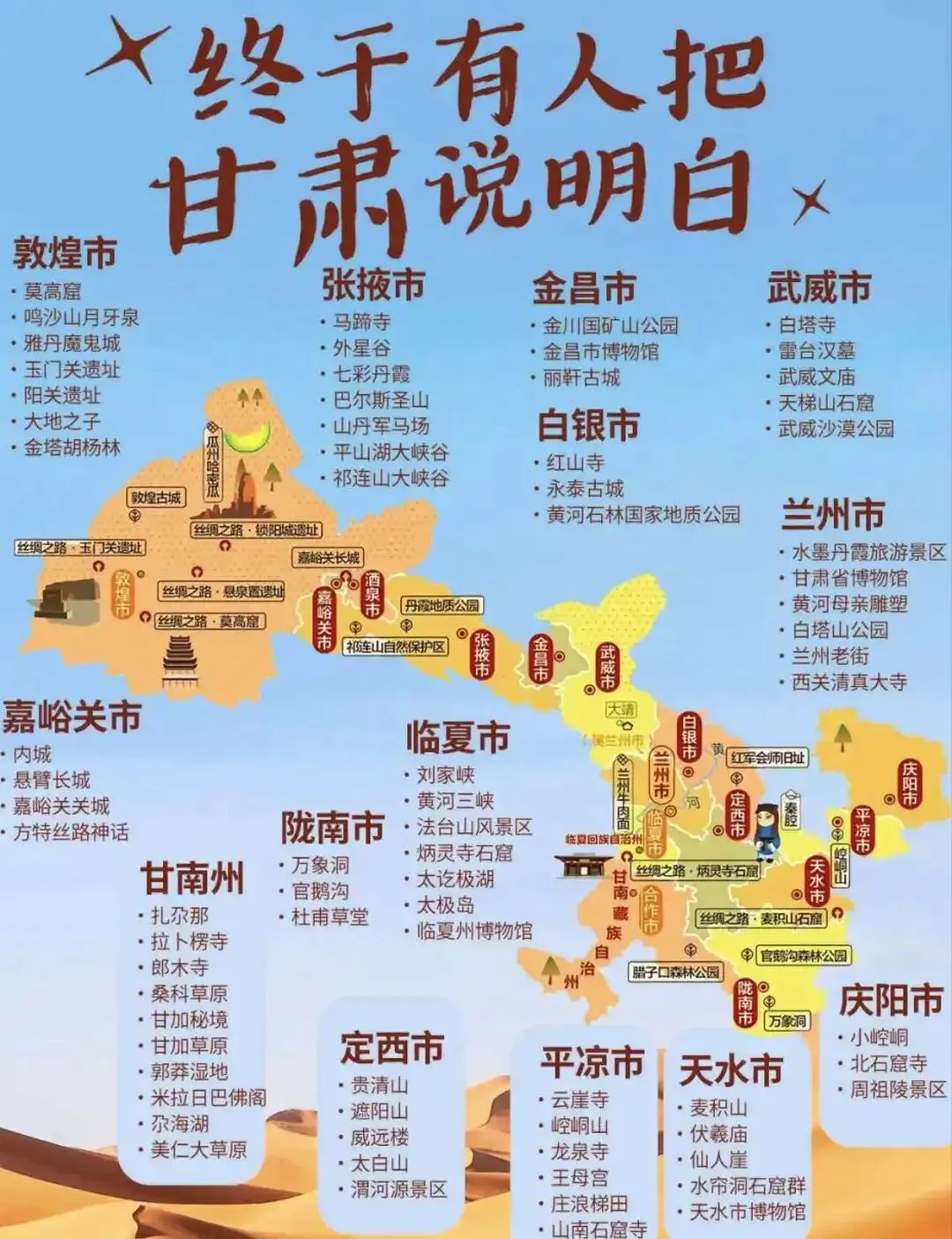 地貌风光:河西走廊」贯穿全境,地貌极其丰富,西部为敦煌戈壁沙漠,中部为祁连山山脉(雪山冰川),东部为黄土高原,南部为陇南山区(喀斯特地貌),兼具「沙漠、雪山、草原、峡谷」,尽显丝路苍茫