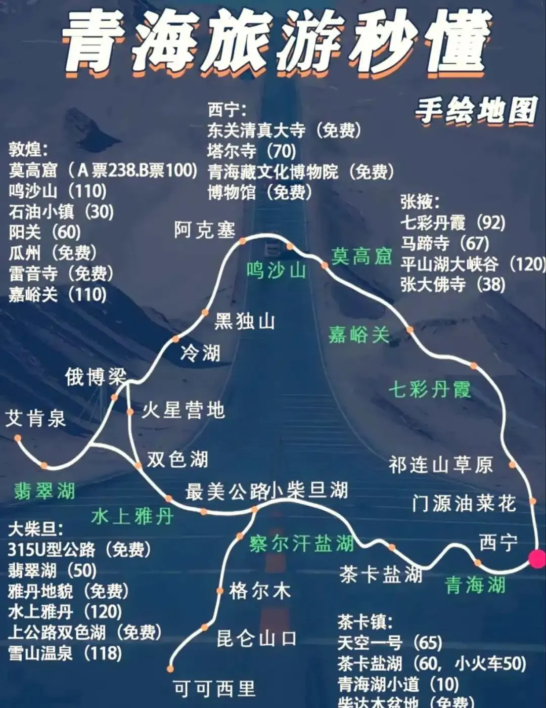 地貌风光:地处青藏高原东北部,以「高原湖泊+雪山草原」为核心,青海湖(中国最大内陆湖)、茶卡盐湖(天空之境)闻名,南部为唐古拉山脉,北部为祁连山,中部为柴达木盆地,纯净且壮阔