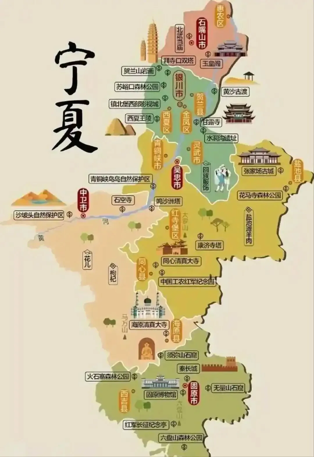 地貌风光:地处黄土高原与内蒙古高原过渡带,北部为贺兰山脉,中部为宁夏平原(黄河冲积而成,有「塞上江南」之称),西部为腾格里沙漠,兼具「山地、平原、沙漠、绿洲」,风光独特