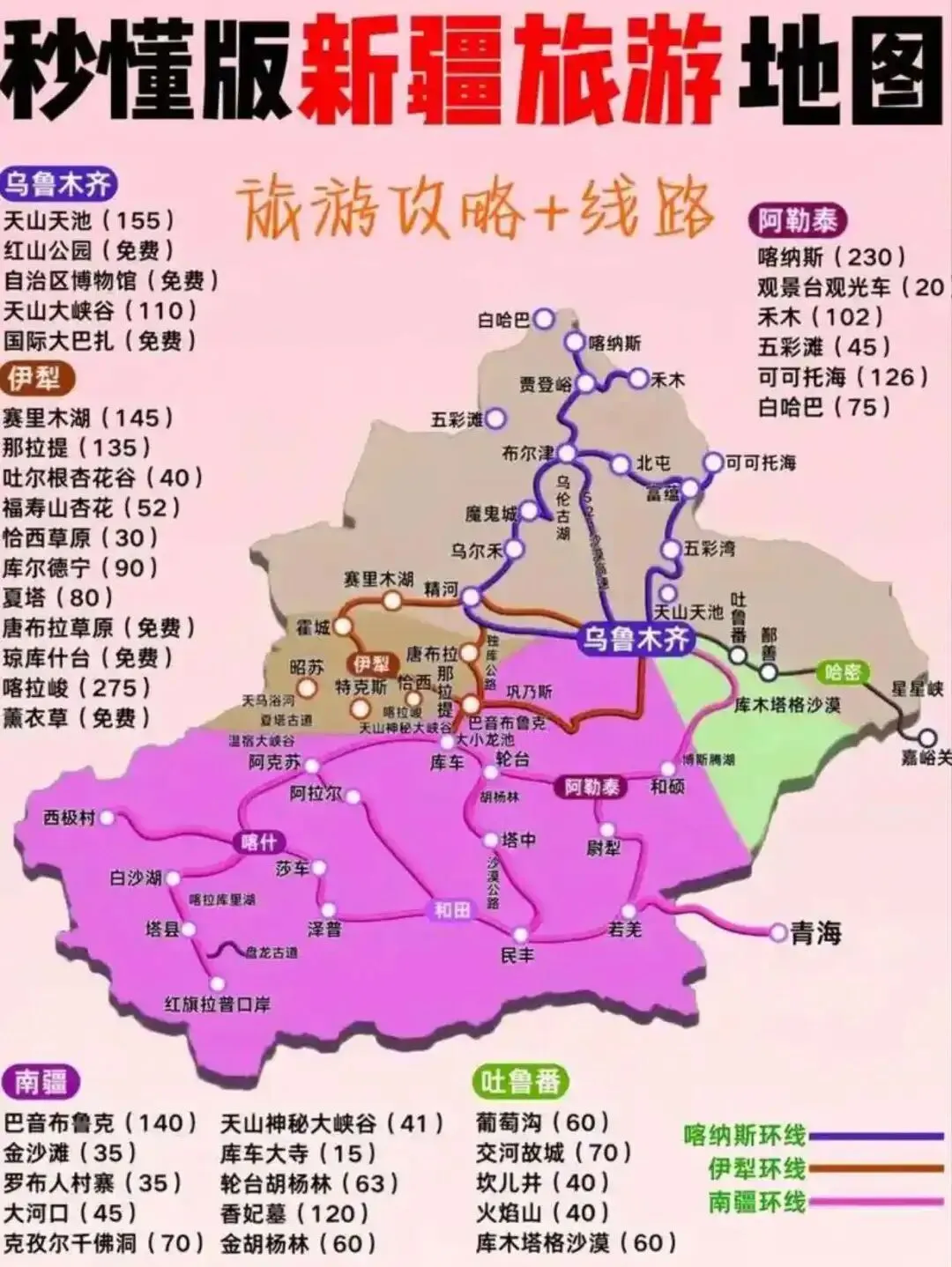 地貌风光:中国地貌最丰富的省份之一,北部为阿尔泰山脉(雪山草原),中部为天山山脉(分割南北疆),南部为昆仑山山脉,塔里木盆地(塔克拉玛干沙漠)、准噶尔盆地分布其间,兼具「雪山、草原、沙漠、戈壁、绿洲、峡谷」,堪称「西域地貌博物馆」