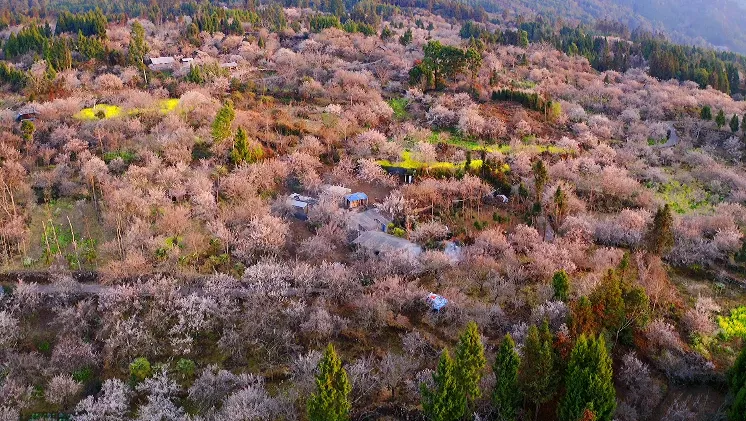 村内种植万亩梅林,蜿蜒的公路从村子中穿过,或火山石堆砌的低矮院墙里,或一围篱笆外,房前屋后,园子中,牛圈边,随处可见一树树白色的梅花,仿佛就是武陵人所见的世外桃源。