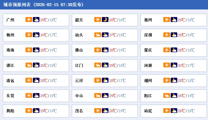15日,广东大部天气温暖和煦,可见阳光,西部市县早晚有雾;中等强度冷空气将于除夕(16日)白天影响粤北,夜间影响中南部市县,伴有小雨天气。