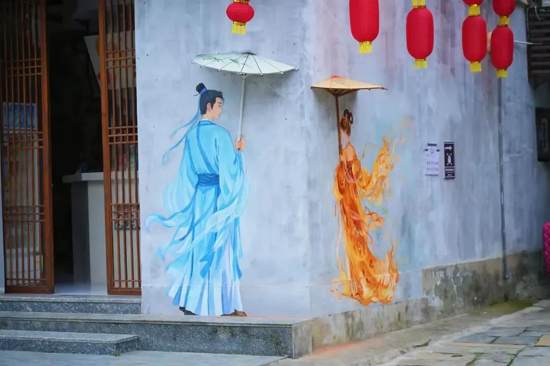 转角遇见艺术——漫步古村,原本素朴的墙面多了几分灵动。一幅幅以古风人物为主题的壁画,悄然融入古村的肌理——仕女执扇倚窗,眉眼温婉如画中走来;文人墨客临溪吟咏,衣袂翩然似从诗词中穿越。与黛瓦白墙相映成趣,每一步都可能与美好不期而遇。