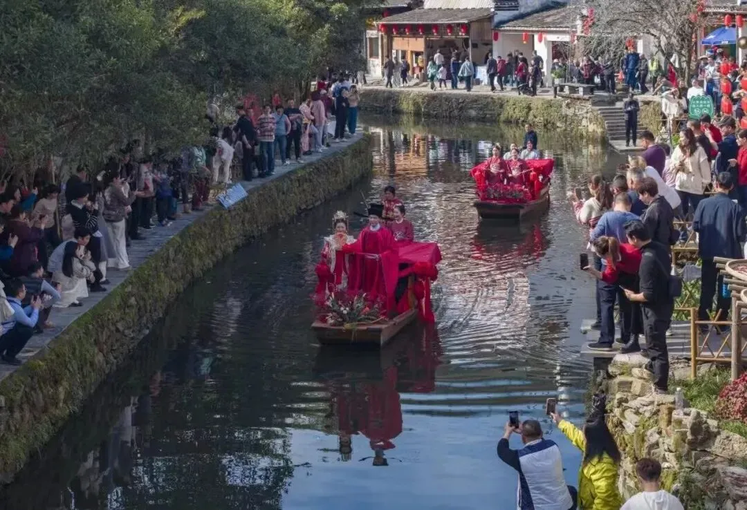 正月初二至初五,李坑景区还推出特别新春活动。徽州新娘凤冠霞帔,乘画舫沿溪巡游,迎亲的队伍穿过古桥,穿过巷陌,唢呐锣鼓和着溪声,把喜庆洒满一路;《长安三万里》、《芳华》主题舞蹈秀在黛瓦白墙间翩然上演。