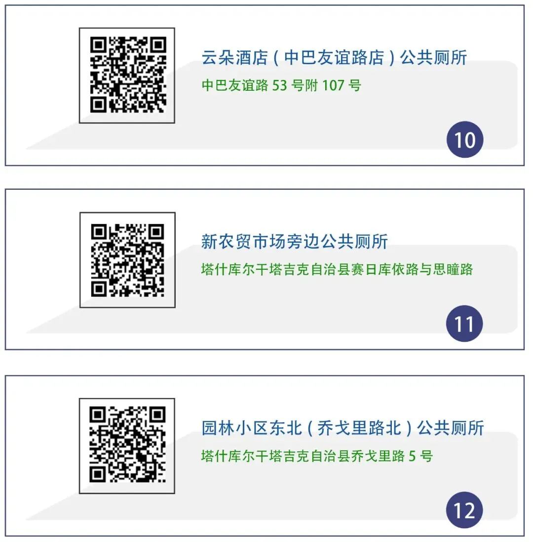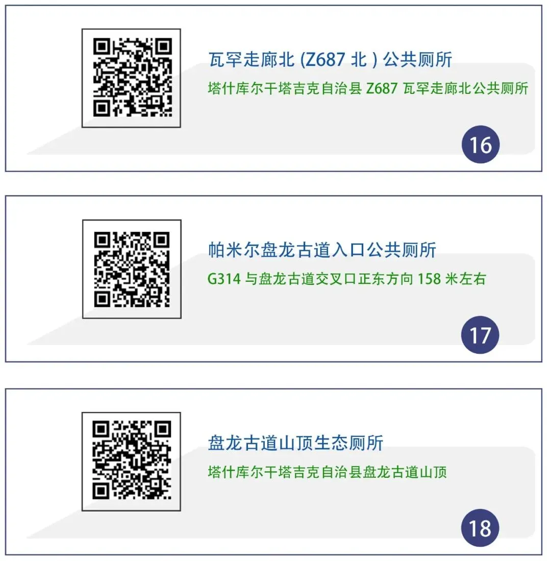 为方便广大游客畅行塔什库尔干,畅游中巴友谊公路、石头城、金草滩、盘龙古道、红其拉甫国门等景点,我们整理覆盖县城、景区、交通沿线、网红打卡点的22处免费旅游公共厕所,干净整洁、管理规范、一键直达,让您高原出行更安心、更舒心、更顺畅。
