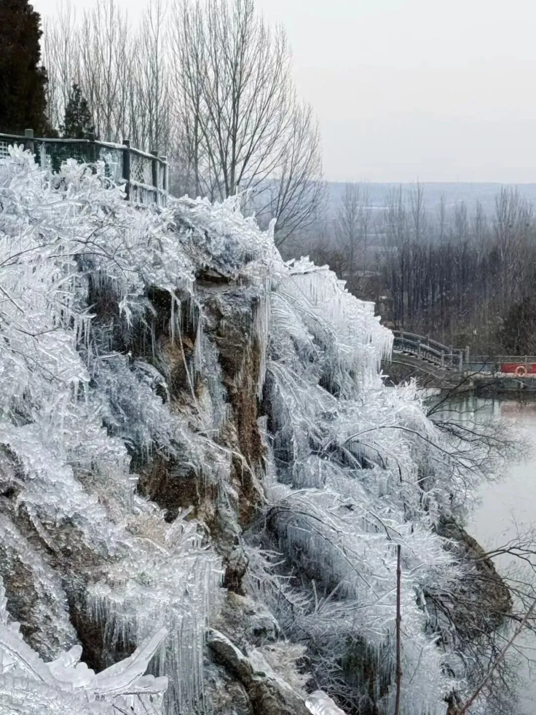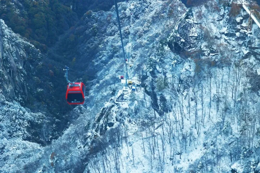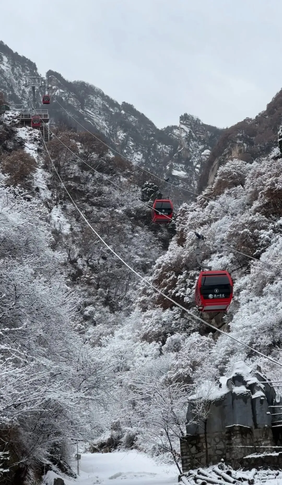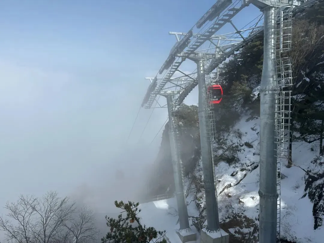 山峰、树林、步道任由点点雪花覆盖,在自然的修饰下染上纯白,山峰不再有棱角,瀑布不再流淌,时间将空间静止,只有悠悠运转的索道和偶尔风刮下的飞雪暗示着时间的流转。