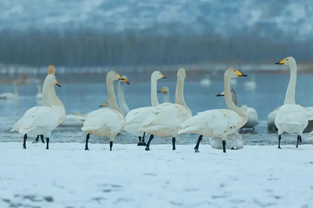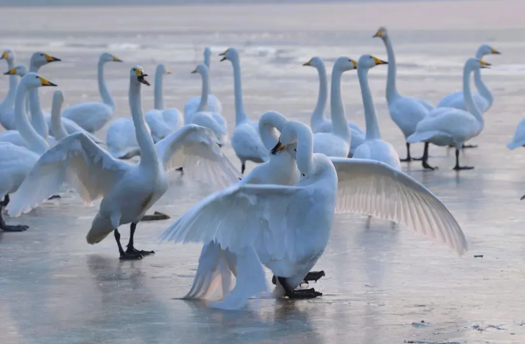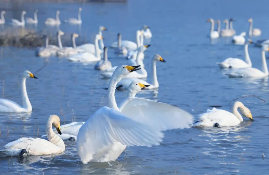 灵宝沿黄生态廊道水草丰美,引来大批白天鹅栖息越冬,仪态优雅的白天鹅掠过水面,舒展着翅膀,使人仿佛置身仙境,流连忘返。
