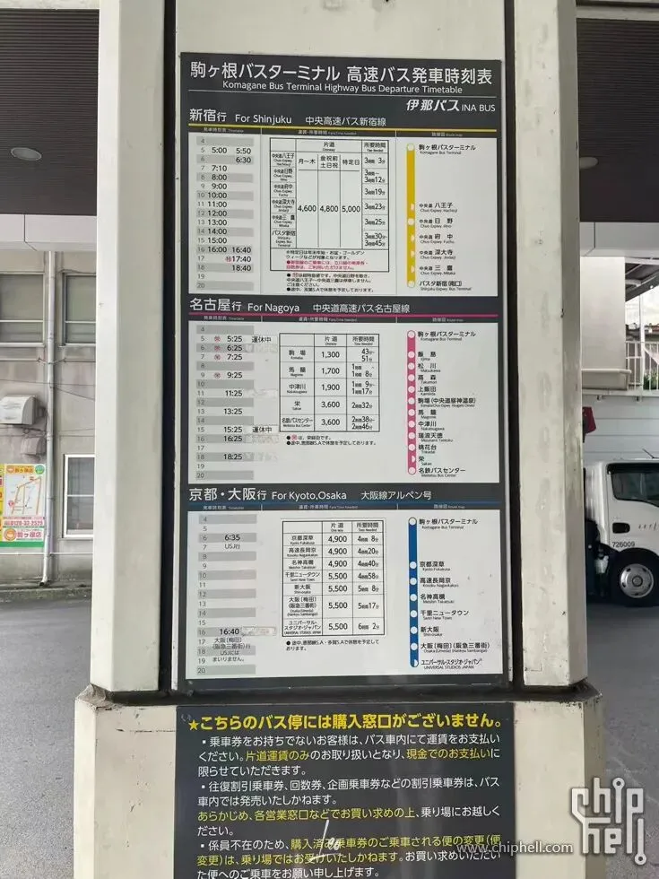 (个人感觉这一天如果足够时间回名古屋更好,驹根酒店又破又贵,吃饭也没什么选择)第四天坐巴士回名古屋,时刻表放在后面了。