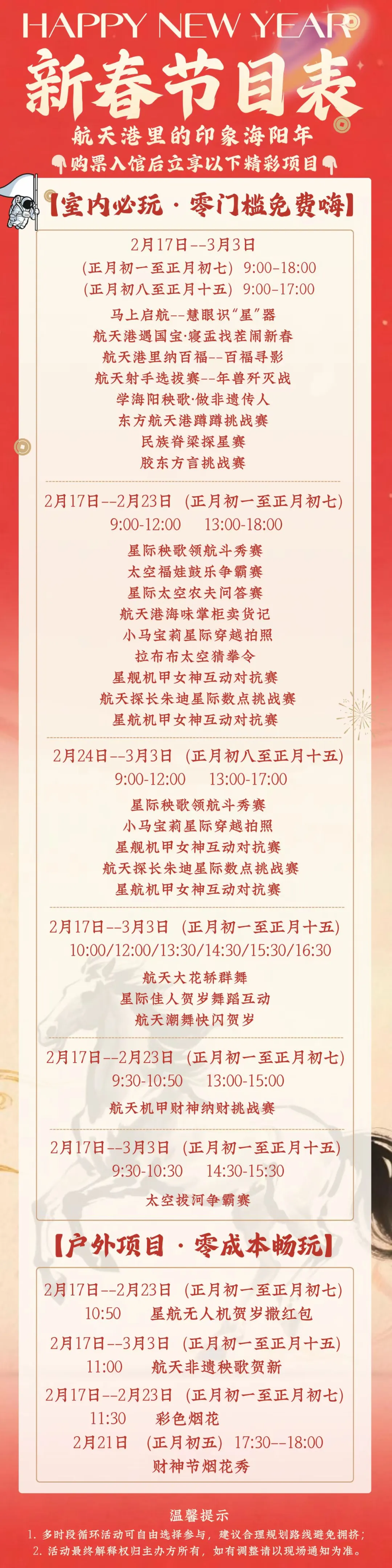 活动内容:活动分室内、户外两大板块,室内设置航天科普互动、海阳秧歌体验、胶东方言挑战、趣味蹲蹲赛等特色项目,以手工制作、NPC主题巡游、沉浸式互动游戏为载体,串联航天科普、非遗体验、民俗互动多元场景;户外面向全体游客开放,定时上演海阳非遗秧歌专场展演,同步推出无人机红包雨、缤纷彩烟秀,初五打造专属“财神节烟花秀”,加码节日氛围感。