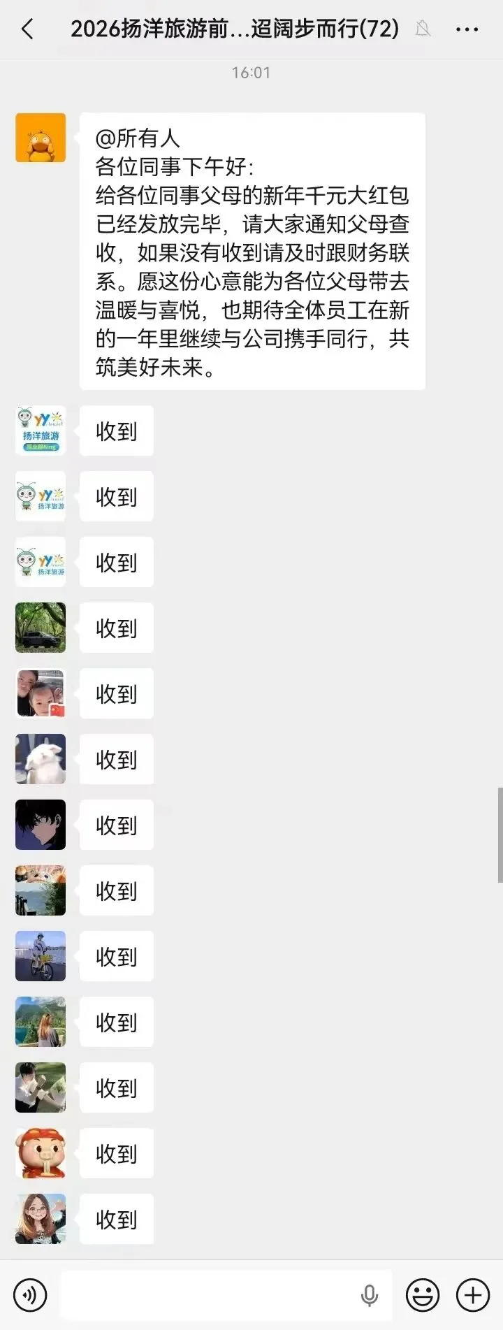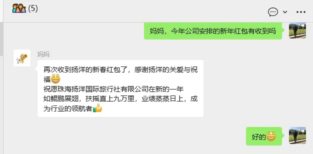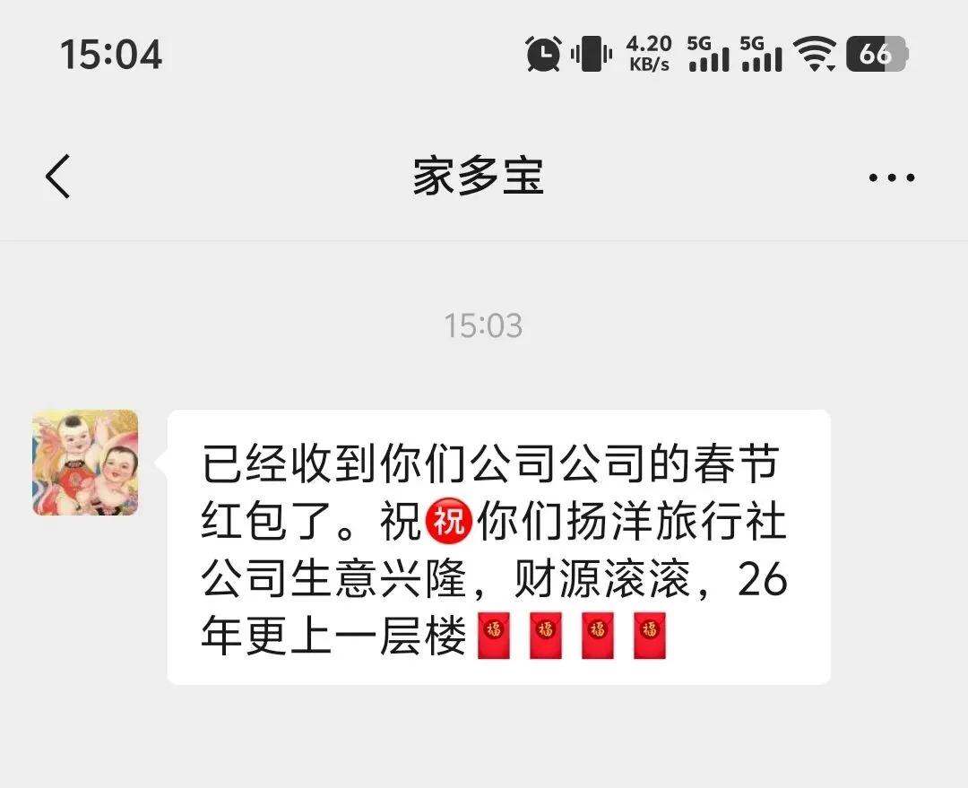 扬洋旅游深知每一位同事的成长离不开父母的悉心教育培养与无私奉献。新年红包不仅是物质上的关怀,更是对同事父母及家人的致敬。