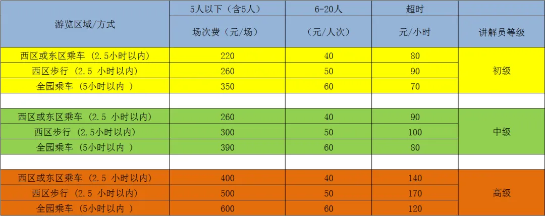 ③ 西游览区或东游览区讲解2.5小时以内,全园讲解5小时内。④ 超时:按照标准收取超时费,不足1小时按1小时收取。