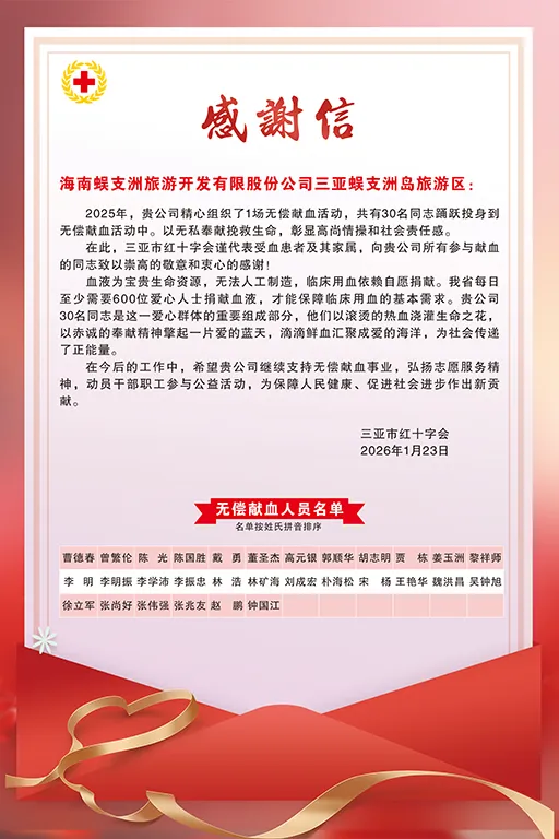 未来,我们将继续以热血作为纽带,以爱心作为桥梁,把这份温暖与担当传递下去,让每一次的公益行动都成为企业发展的精神注脚。蜈支洲岛将始终步履不停,为守护生命、传递温暖贡献更多的文旅力量。