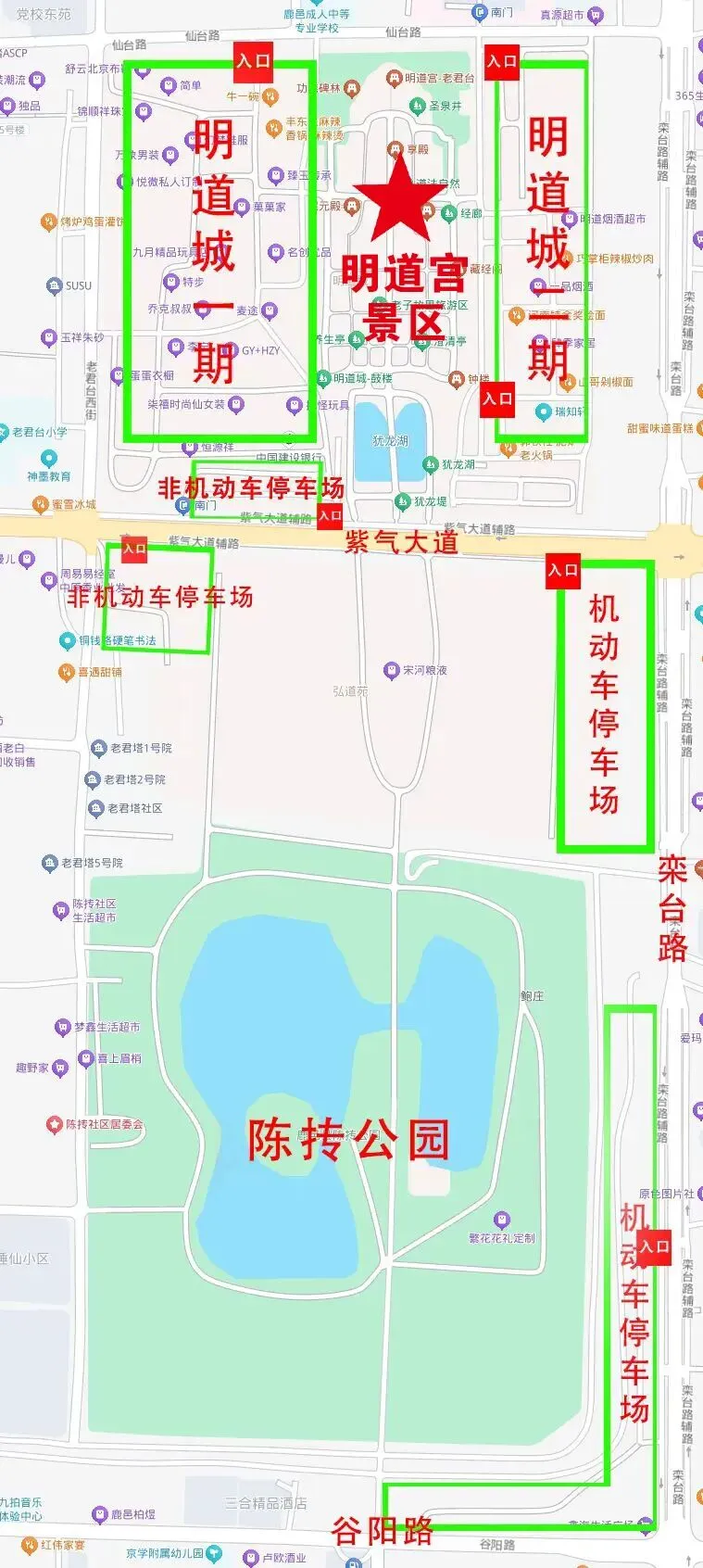 为缓解景区周边停车压力,保障道路畅通,前往明道宫景区的机动车,请自觉前往以下指定停车场有序停放,严禁在管控路段及周边随意占道停放: