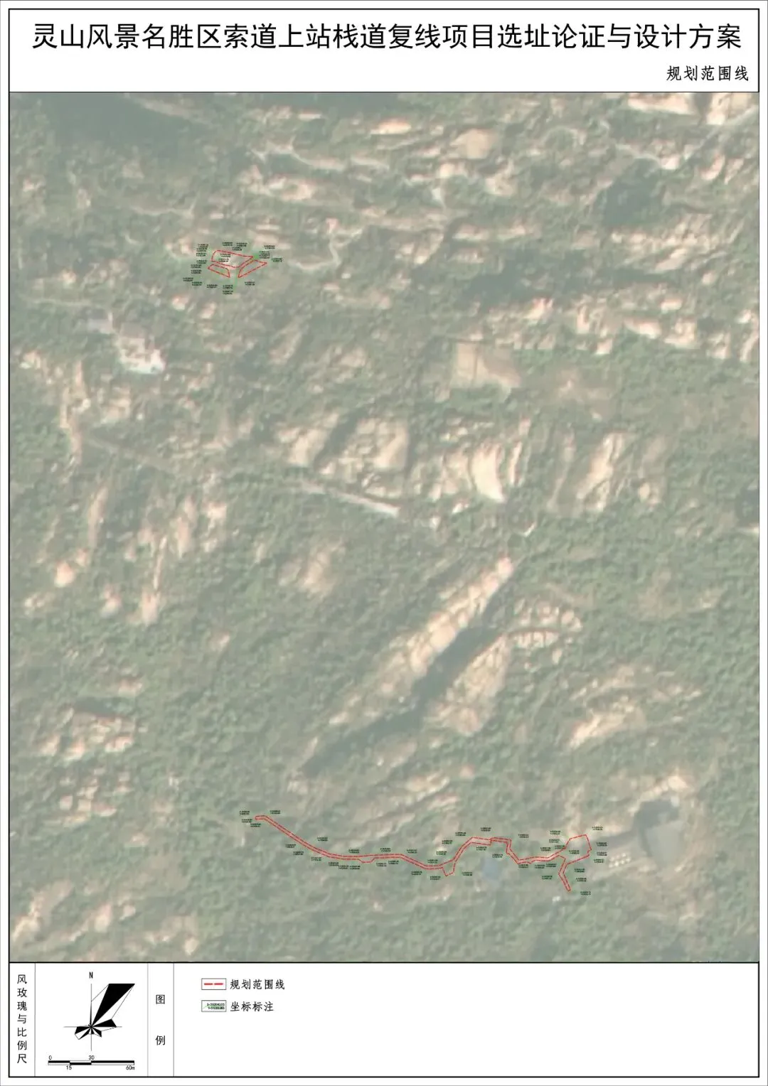 广信区灵应山景区管理有限公司申请拟建灵山风景名胜区左溪索道上站复线项目,该项目位于灵山风景名胜区水晶山景区一级保护区内,包含三个建设内容:1、栈道复线:位于原有栈道北侧,线路全长为278.86m,宽2.0米,局部拓展2处休息平台,用地面积约为552.98㎡,用于缓解高峰期游客通行拥堵问题;2、索道上站疏散平台概况:位于索道上站西北角,用地面积约189.58㎡,上下两层平台,作为景区高峰期索道等候区游客疏散平台;3、敖烈出海观景平台:现状平台面积约76.12㎡,拟扩建平台面积约464.55㎡,作为休息、观景和缓解栈道高峰期疏散游客的备用平台。