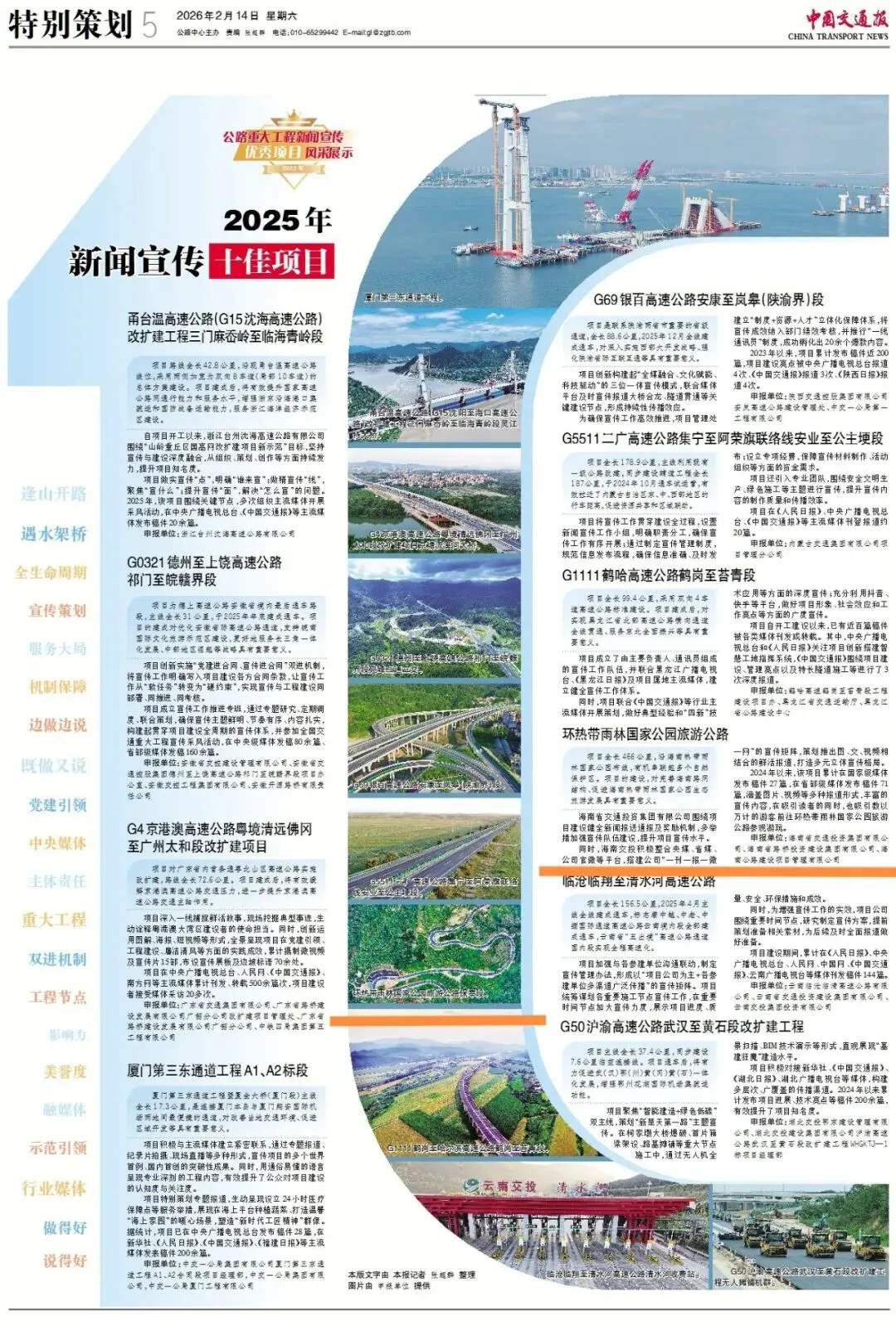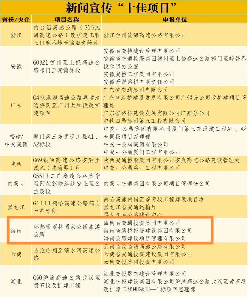 2月14日,《中国交通报》揭晓2025年公路重大工程新闻宣传“十佳项目”推选展示活动结果。经过项目申报、两次专家审核、展示公示等程序,由海南交通集团投资建设的环热带雨林国家公园旅游公路项目,从全国众多申报项目中脱颖而出,荣获2025年公路重大工程新闻宣传“十佳项目”,成为我省此次唯一获奖的工程项目。