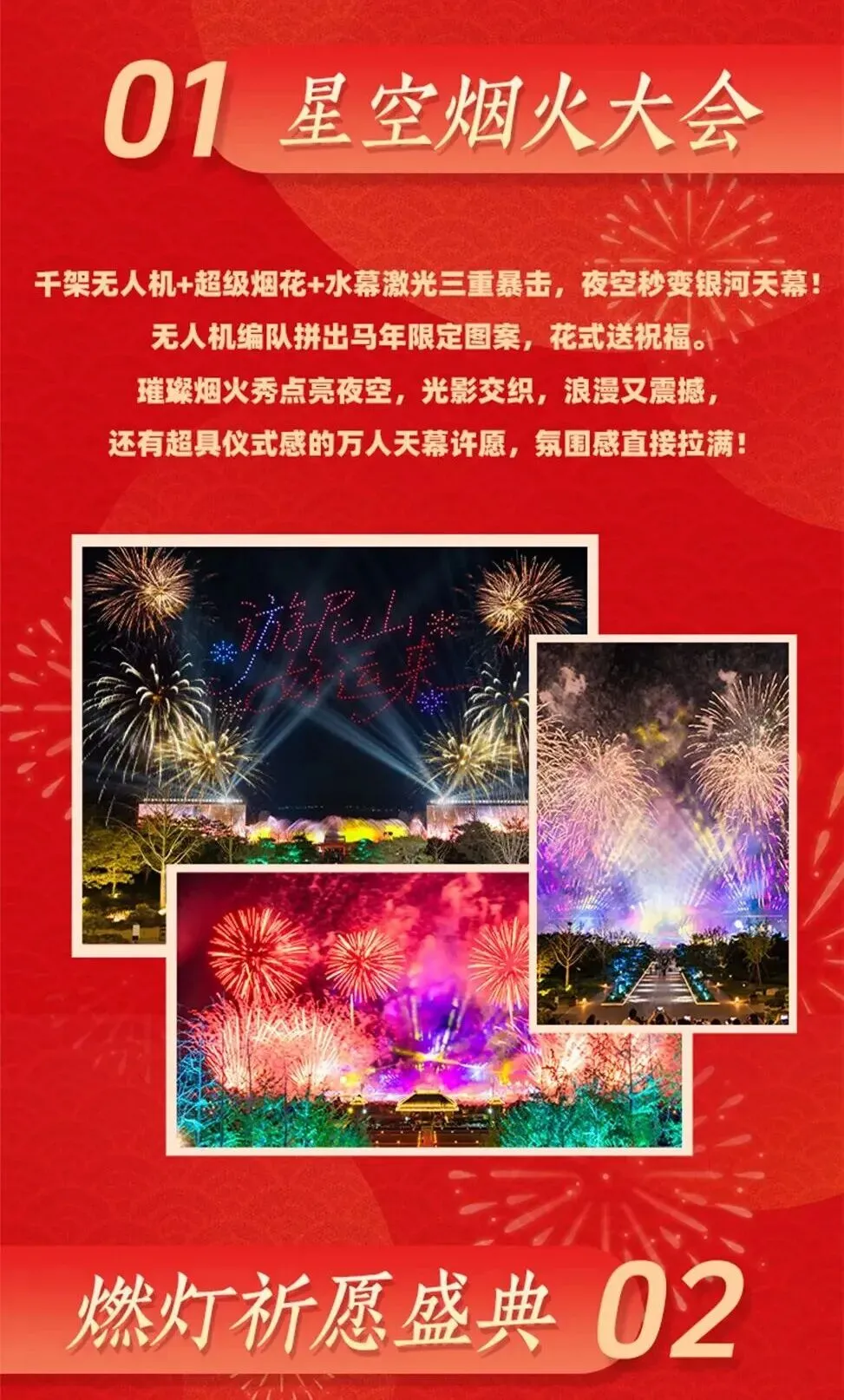 从白天的震撼马战贺岁、奇幻火虎出山,到夜晚绚烂的九山铁花、浪漫鱼灯巡游与星空烟花秀,每日上百场演艺轮番登场。时间:2月10日—3月3日