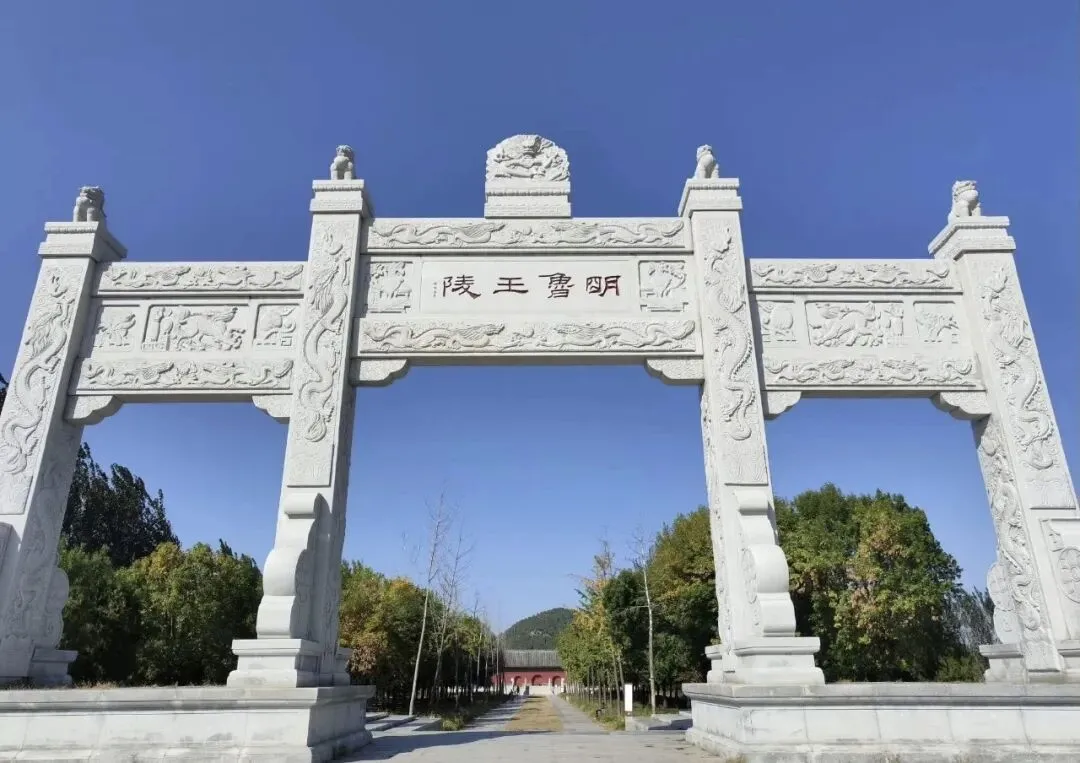 明鲁王陵位于邹城市九龙山南麓,是明太祖朱元璋第十子朱檀(1370-1389年)及其妃子的陵墓。陵区规模宏大,整体布局由导引区、陵园区和陵寝(地宫)三部分组成,外围筑有双重城垣。外城墙南北长1200米,东西宽800米,占地约96万平方米。其中,陵园区南北长206米,东西宽80米,是已发掘的明代亲王陵园中规模最大、规格最高者之一。陵园内主要建筑依次包括御桥、陵门、二门、享殿、明楼,最后通向核心的地宫。该墓考古发掘出土各类文物1000余件,是山东省迄今发现的出土文物数量最为丰富的明代王陵,具有极高的历史与艺术价值。