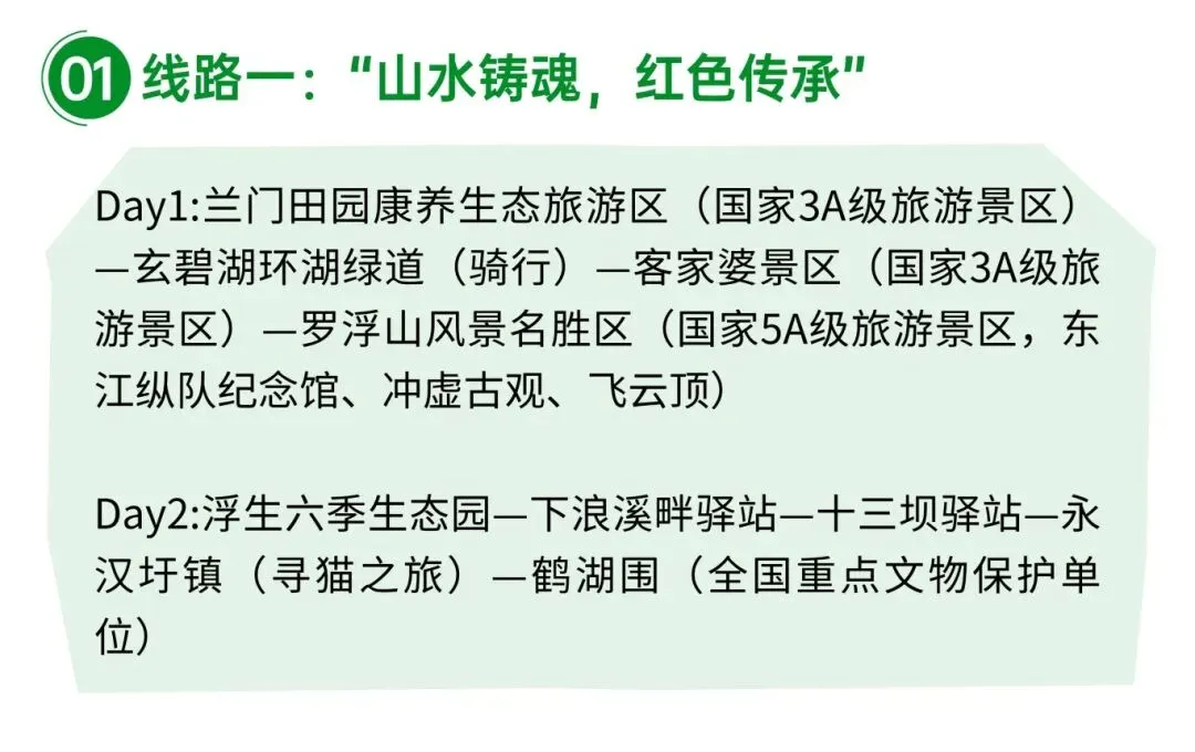 本线路以山水康养、红色研学、古村民俗为核心主题,打造兼具休闲体验与红色教育意义的新春精品路线。首日畅游兰门田园康养生态旅游区,沿玄碧湖环湖绿道悠然骑行,打卡国家3A级景区客家婆景区,品尝非遗豆腐花;登临国家5A级景区罗浮山风景名胜区,在东江纵队纪念馆感悟革命初心,赏飞云顶自然盛景、品冲虚古观千年人文底蕴。次日漫步浮生六季生态园,途经下浪溪畔驿站、十三坝驿站饱览乡野风光;探访永汉圩镇开启寻猫之旅,走进全国重点文物保护单位鹤湖围,一站式体验田园野趣、生态休闲与红色文化,沉浸式感受自然与人文交融的新春出游之美。