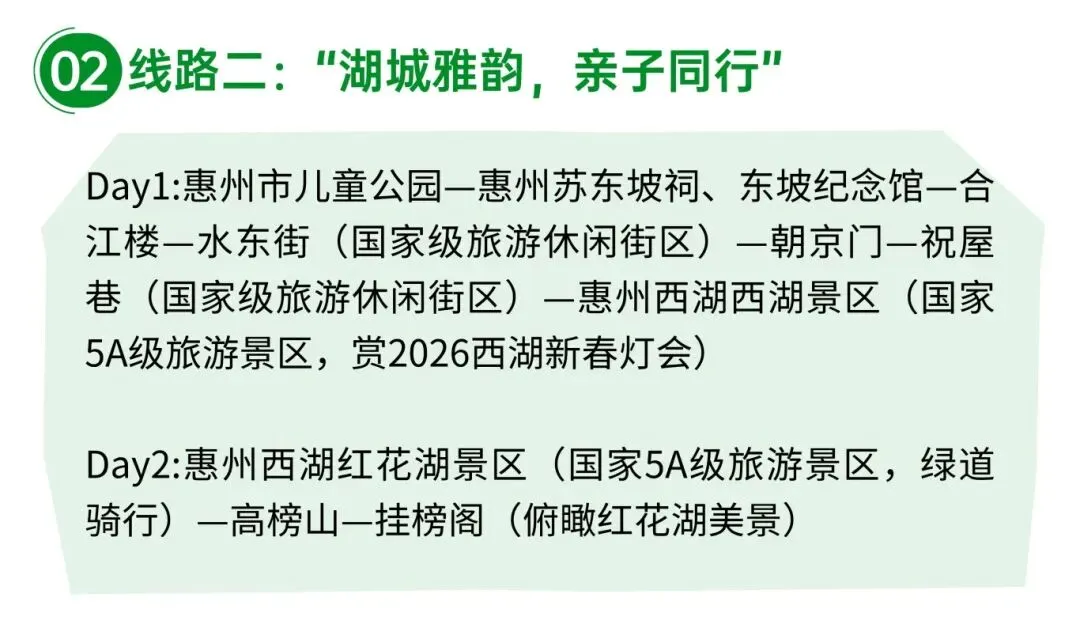 本线路主打城市人文、湖山风光与亲子休闲,适合全家出行感受惠州年味。首日畅玩惠州市儿童公园,解锁亲子欢乐时光;寻访惠州苏东坡祠、东坡纪念馆,打卡合江楼、朝京门,触摸千年古城文脉;漫步水东街、祝屋巷两大国家级旅游休闲街区,体验市井烟火;夜游惠州西湖,观赏2026西湖新春灯会,沉浸式邂逅湖光灯影之美。次日打卡红花湖景区,悠然骑行绿道饱览湖山盛景;攀登高榜山、登临挂榜阁,俯瞰红花湖与湖城全景,动静之间尽享自然之趣,让亲子家庭在人文与山水交融中欢度暖冬新年。
