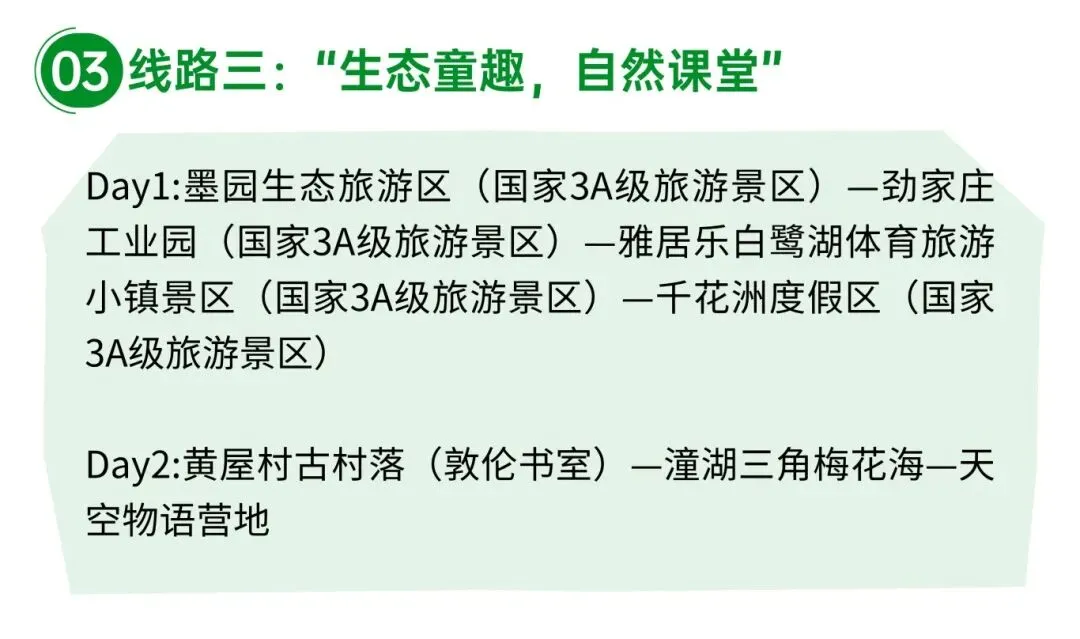 本线路聚焦生态观光、亲子游乐与乡村野趣,打造沉浸式自然研学之旅。首日串联四大国家3A级景区:漫步墨园生态旅游区感受原生自然肌理;参观劲家庄工业园,了解“工业+旅游”,体验五谷健康食品;徜徉雅居乐白鹭湖体育旅游小镇景区邂逅湖光山色;畅玩千花洲度假区解锁多元游乐项目,让孩子在自然浸润与趣味体验中快乐成长。次日走进黄屋村古村落,探访敦伦书室感受百年书香文脉;打卡潼湖三角梅花海,沉浸于绚烂花境定格新春美照;在天空物语营地体验户外休闲乐趣,一站式集齐田园风光、浪漫花海、古村底蕴与露营野趣,全程轻松惬意又出片,让亲子时光满溢欢乐与治愈。