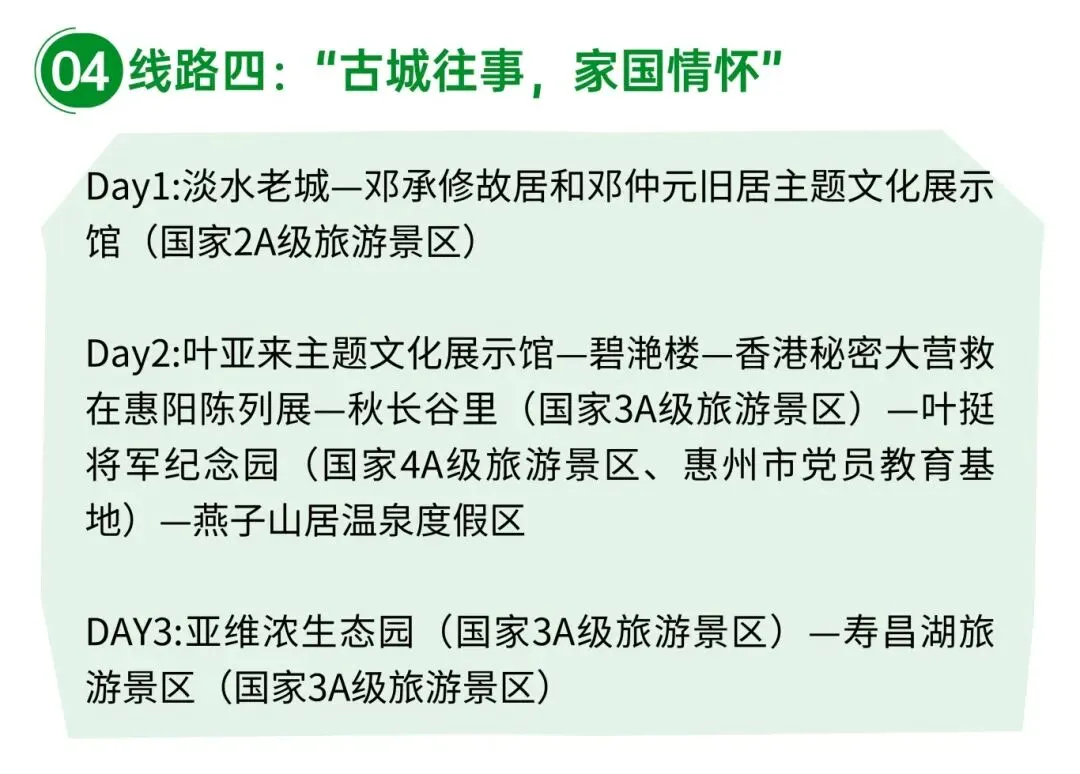 本线路深度融合古城年味、名人史迹、红色教育与温泉康养,适合文化探寻与家庭出游。首日漫步淡水老城,探访邓承修、邓仲元故居,在青砖黛瓦间重温家国记忆,感受古城厚重文脉。次日走进秋长,瞻仰叶挺将军纪念园,打卡碧滟楼、叶亚来故居,参观香港秘密大营救陈列展,接受红色精神和华侨奋斗精神洗礼;夜宿燕子山居温泉度假区,以温润汤泉舒缓身心。第三天畅游亚维浓生态园、寿昌湖旅游景区两大国家3A级景区,在自然生态中延续人文感悟,全程年味浓郁、情怀深厚,兼具文化浸润与休闲质感。