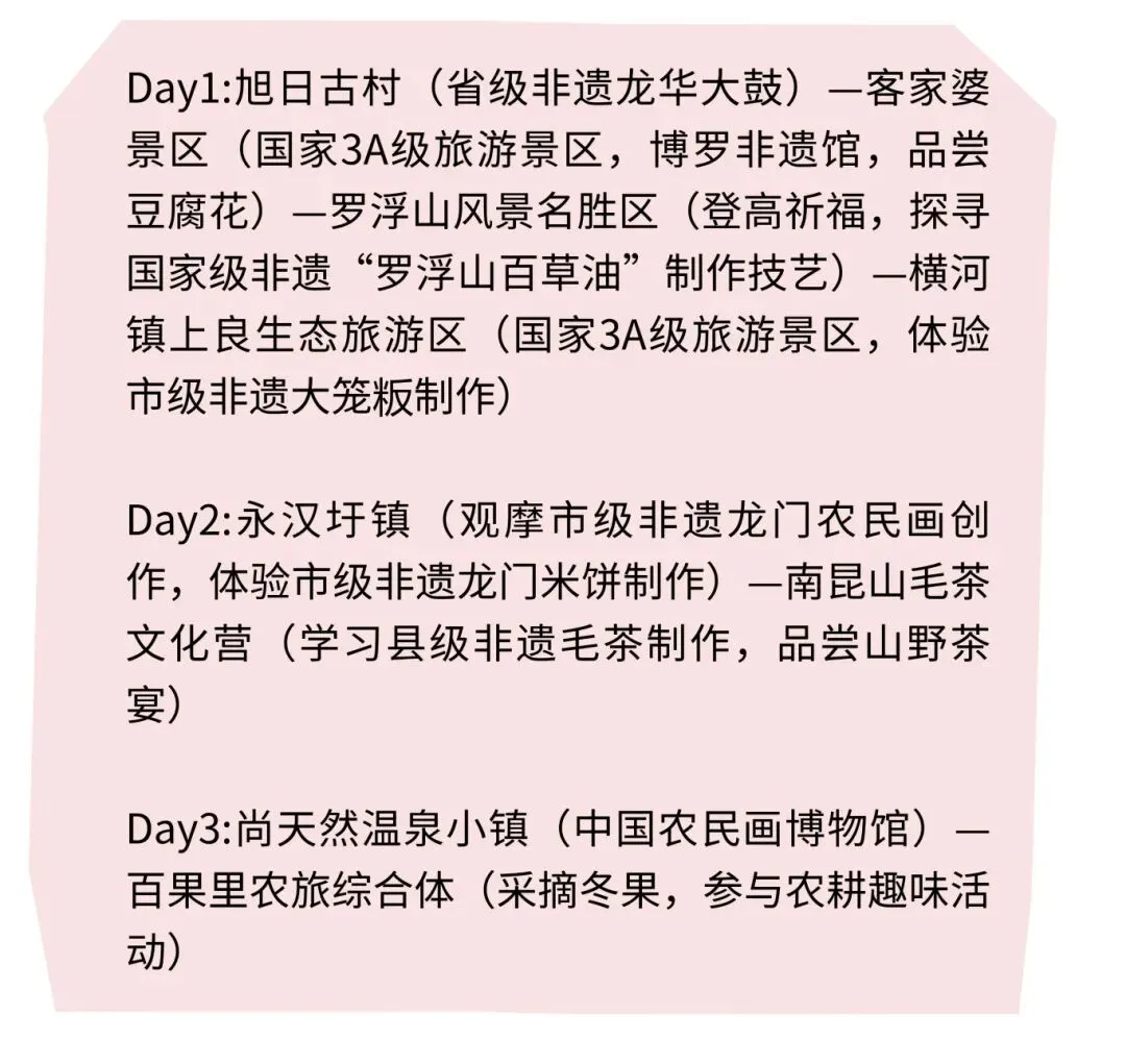 本线路串联惠州博罗、龙门非遗与生态资源,打造三日沉浸式客家文化体验之旅。首日漫步旭日古村,聆听省级非遗龙华大鼓的雄浑鼓点,打卡客家婆景区赏非遗展品、尝地道豆腐花,前往罗浮山登高祈福,探寻国家级非遗罗浮山百草油的古法制作技艺,再到上良生态旅游区亲手制作市级非遗大笼粄。次日走进永汉圩镇,观摩市级非遗龙门农民画的乡土创作,体验龙门米饼手工制作,赴南昆山毛茶文化营研习县级非遗毛茶技艺,品味山野茶宴的自然风味。第三天打卡尚天然温泉小镇的中国农民画博物馆,饱览岭南乡土艺术精粹,再到百果里农旅综合体采摘冬果、参与农耕趣味活动,感受田园野趣。全程融非遗体验、山水观光、田园休闲于一体,深度领略惠州客家文化的独特魅力与乡村文旅的别样风情。