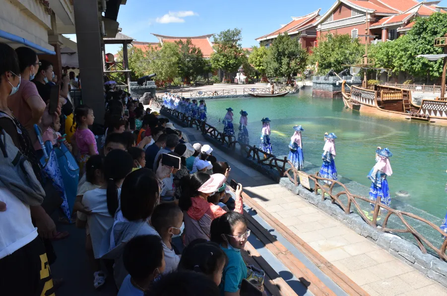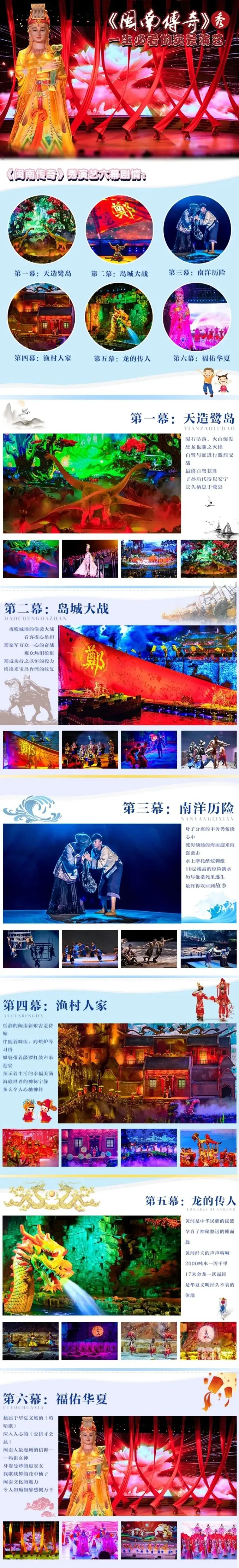 观赏【世界首家360°顶级环绕室内实景舞台秀——闽南传奇】闽南传奇秀打破了五千年来单一的舞台观演模式,通过移动看台把观众送到每幕视角的最佳观赏位置,欣赏真山真水演出。会跑的观众席被包装为一艘巨轮,四周以水面做掩体,各种大件舞美埋在水中内藏玄机【恐龙王国】、【极限跳水】、【火山爆发】、【岛城大战】、【海上斗匪】、【水面飞兽】、【飞龙出水】幕幕精彩不断,给大家带来悬念,震撼,刺激、欢快的超级文化娱乐体验。