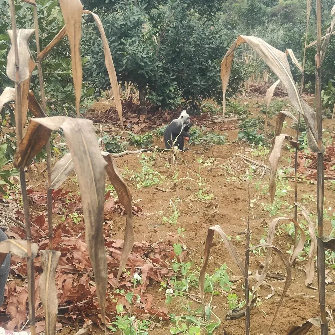 过了一两个小时,我们终于等到了一只比较大胆的白头叶猴,我们到的时候,他正拿着一个地瓜津津有味地吃着,吃完了,又自个儿刨了一个大地瓜🍠继续吃。他的胆子真的特别大,离我们几乎只有5m,大家都不敢说话,也不敢再靠近,深怕惊到它。我在一个角落悄悄地拍下了它吃地瓜的所有细节,但很可惜没有拍到金黄色的小猴子。