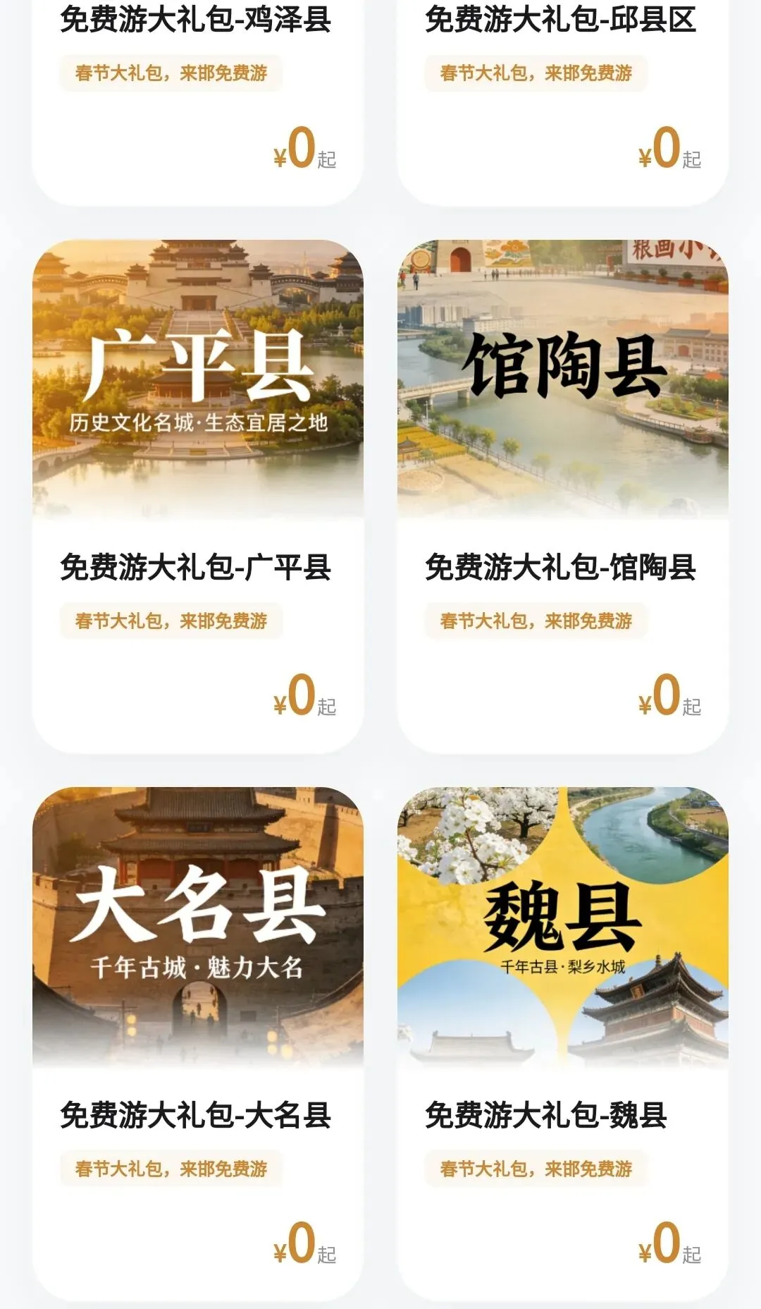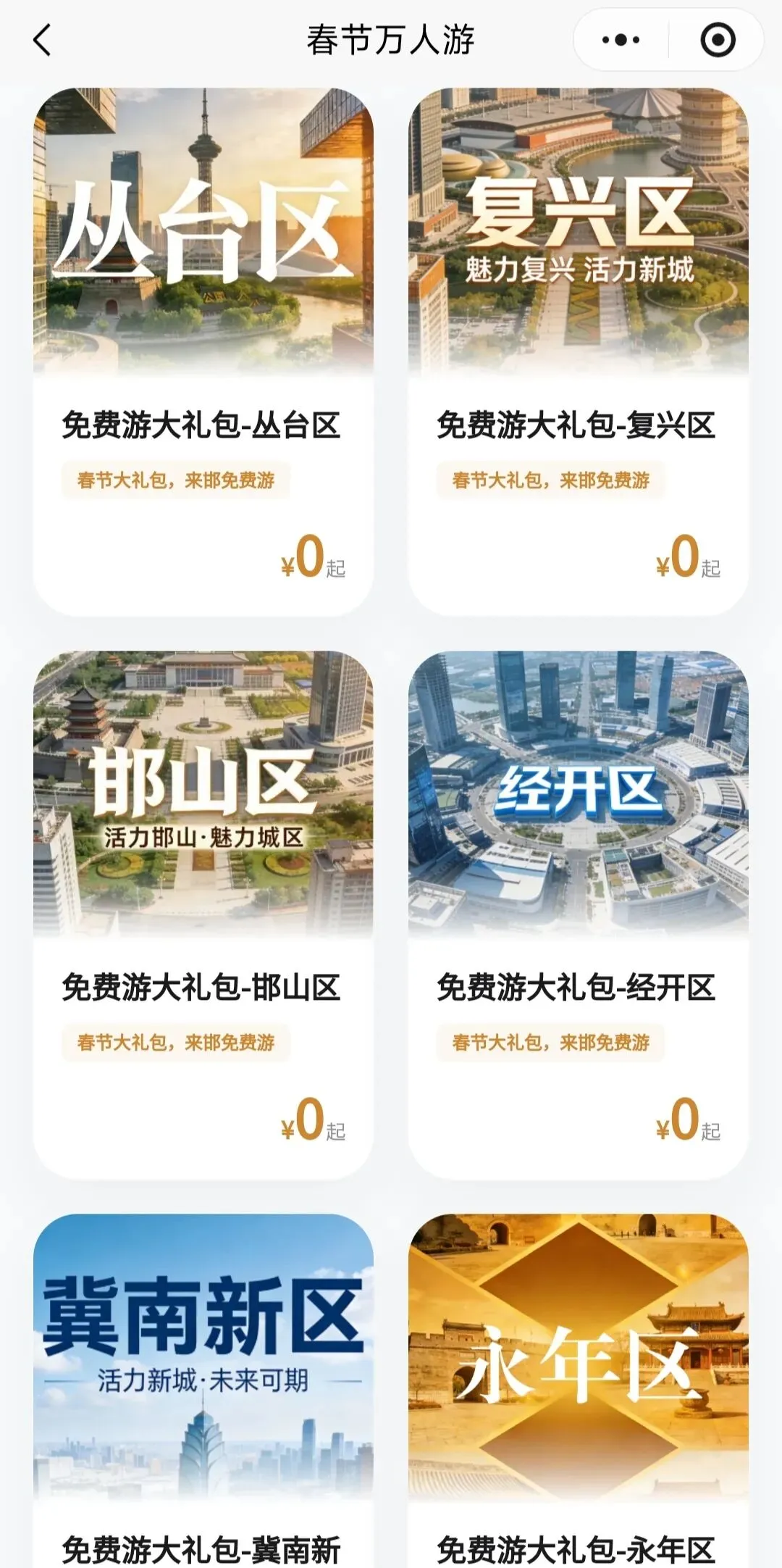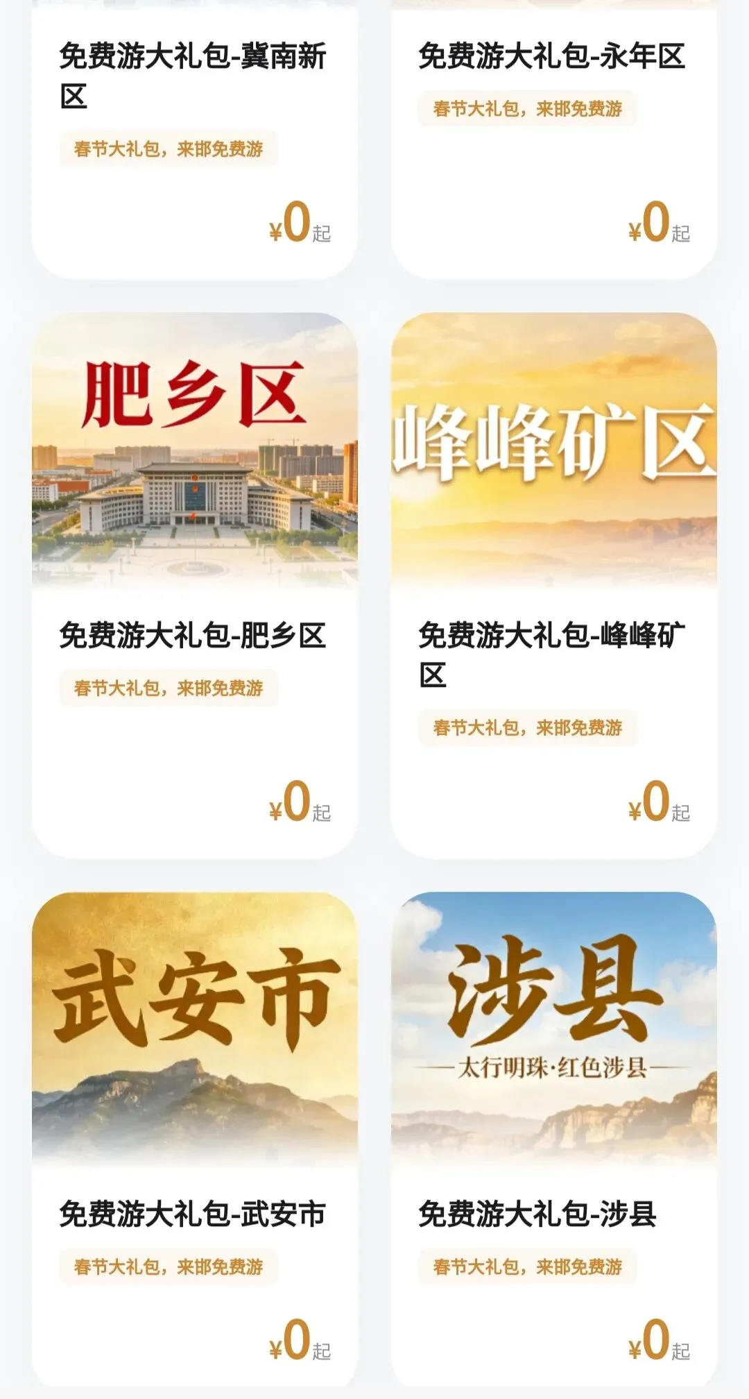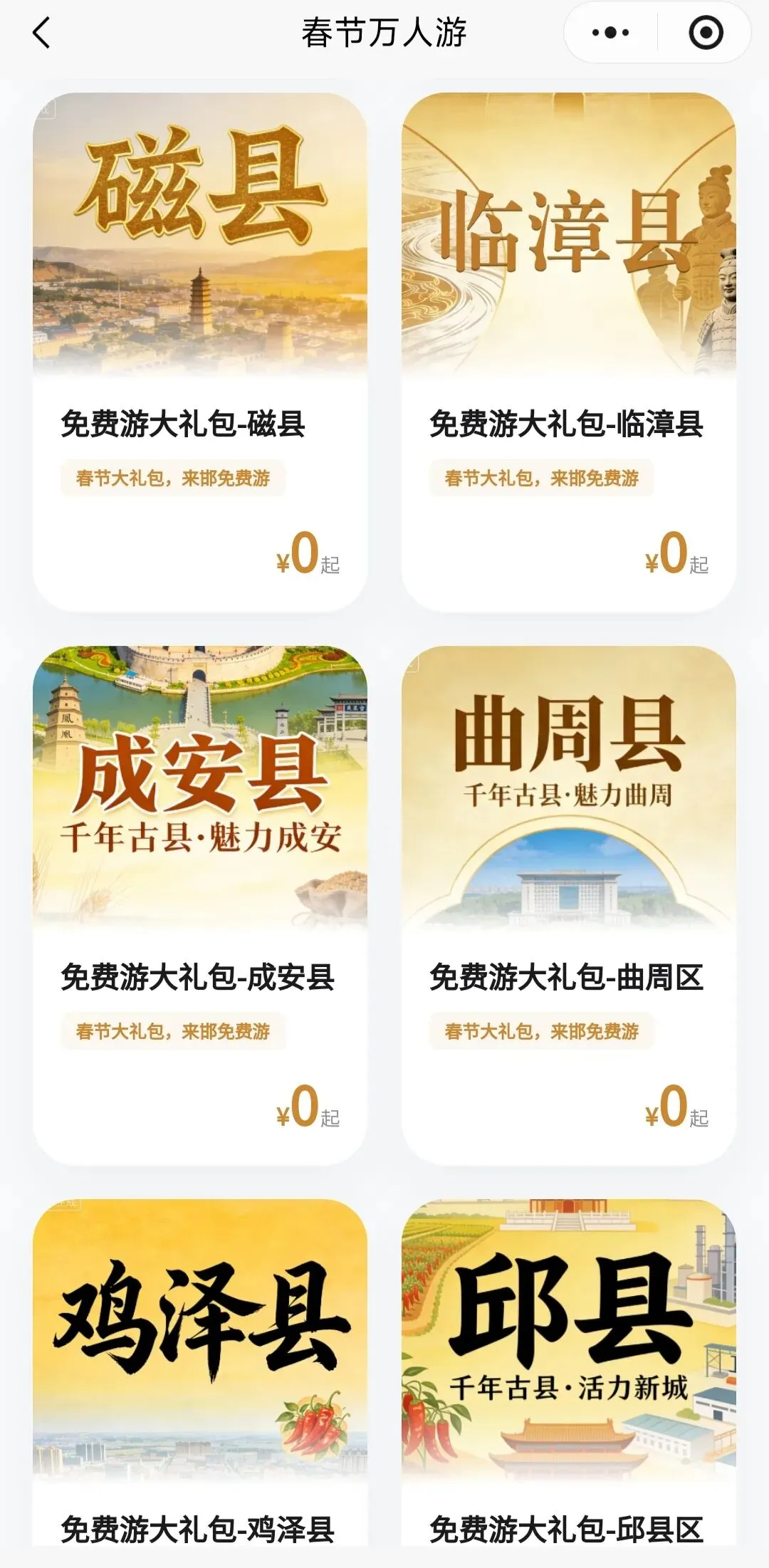 万人免费邯郸旅游。已经领取。看下面图片。门票。住宿。吃饭。都免费。出个开会路费就可以。图片有详细介绍。不懂的留言咨询。