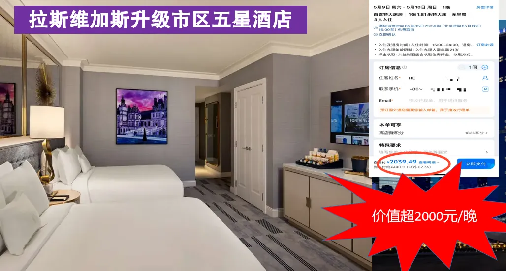 含内陆航班行李托运!拉斯维加斯升级一晚当地五星酒店