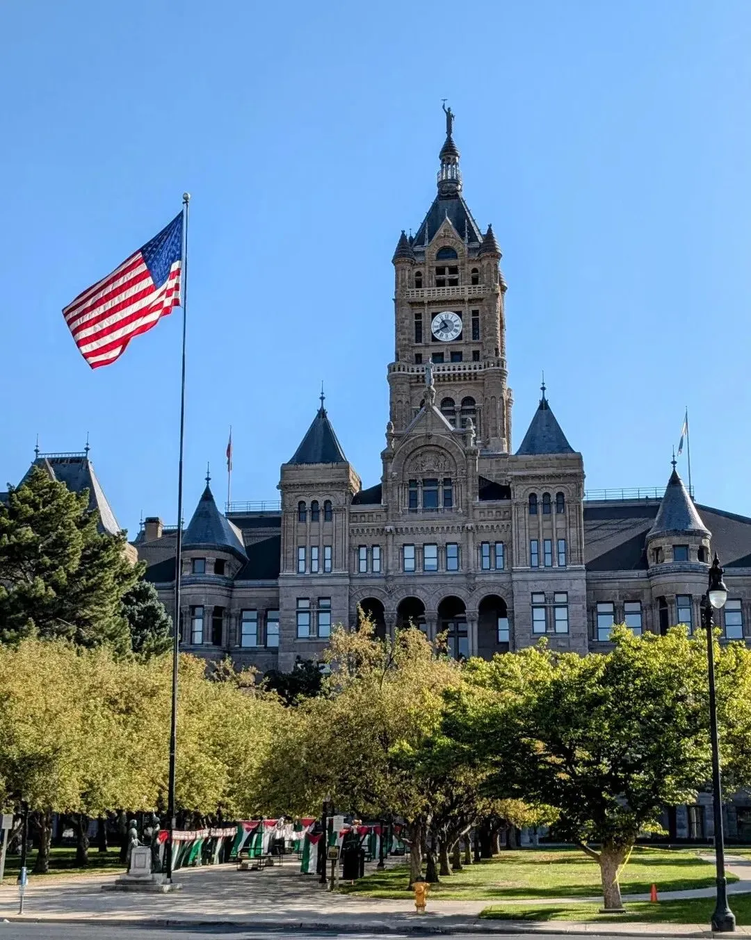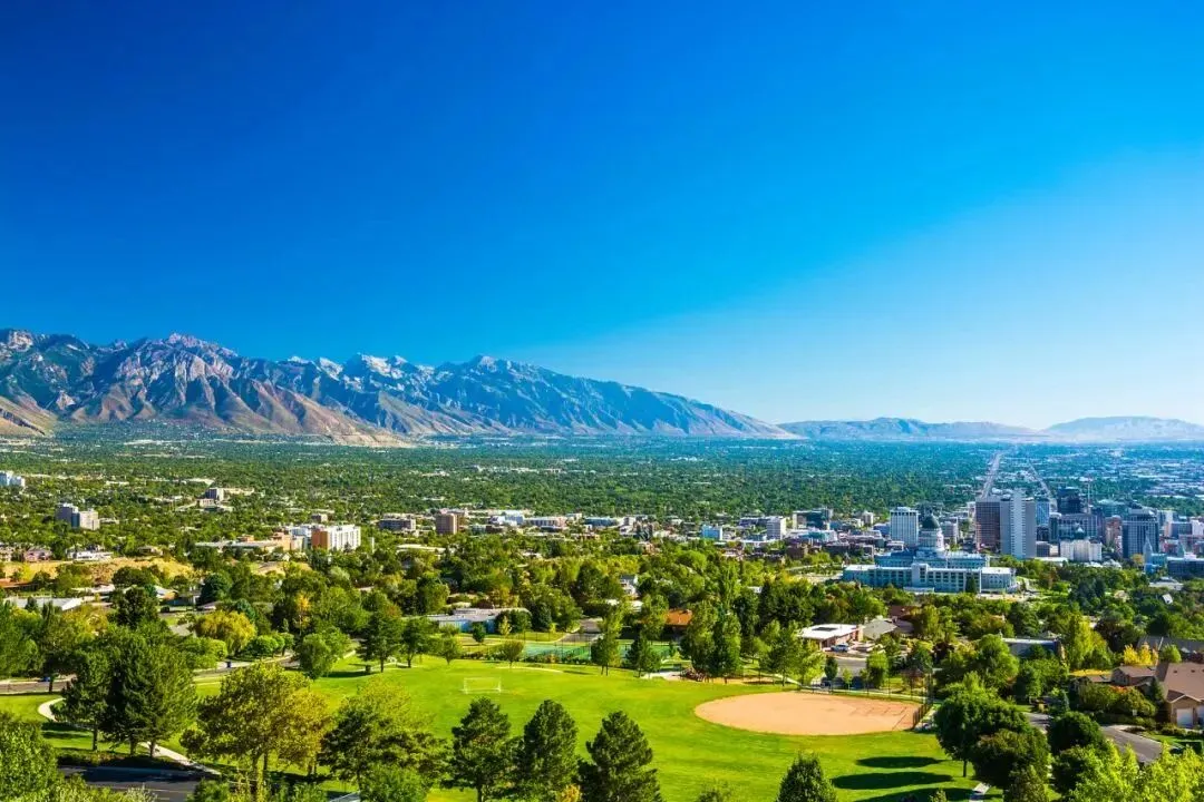 巍峨的摩门圣殿在阳光下闪闪发光,