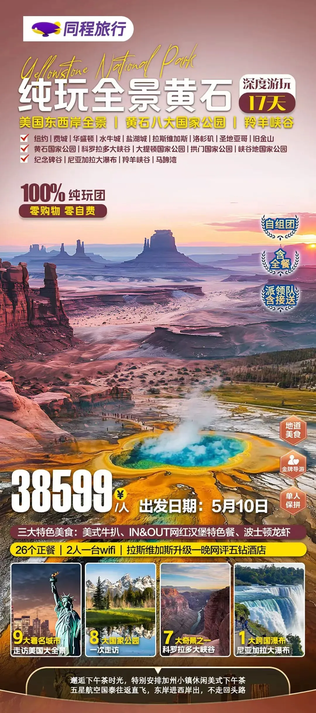 【0购物0自费】旅游清单+1!直飞!含签证!全包餐!17天玩遍美国东西岸,9大名城+8大国家公园+双游船,一次过足瘾