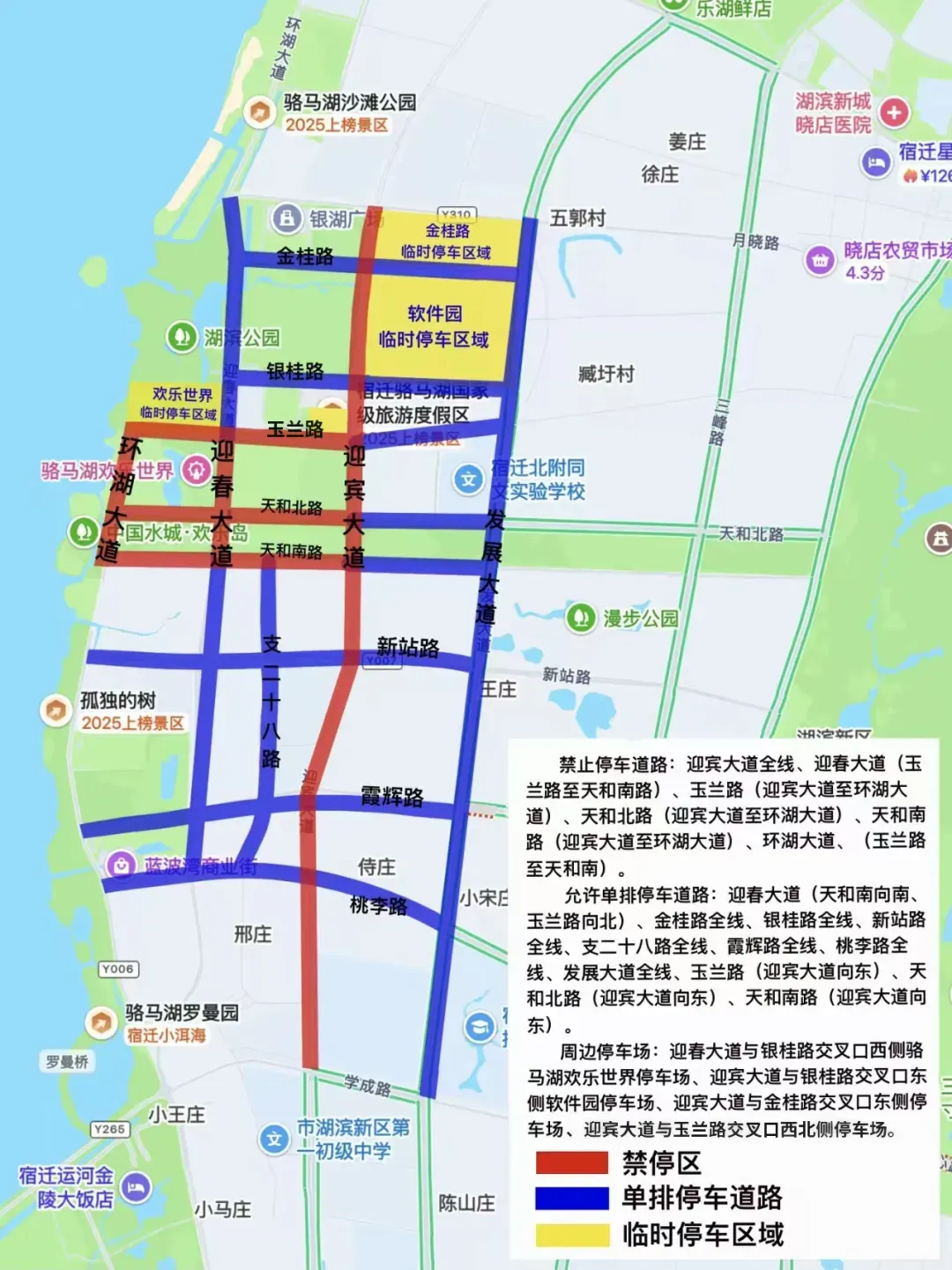 交通管制路段:骆马湖碧湖银滩周边的天和南路、天和北路、玉兰路(迎宾大道至环湖大道)、环湖大道(天和南路至玉兰路)将实施交通管制,禁止社会车辆驶入,迎春大道、迎宾大道将视情分段放行。