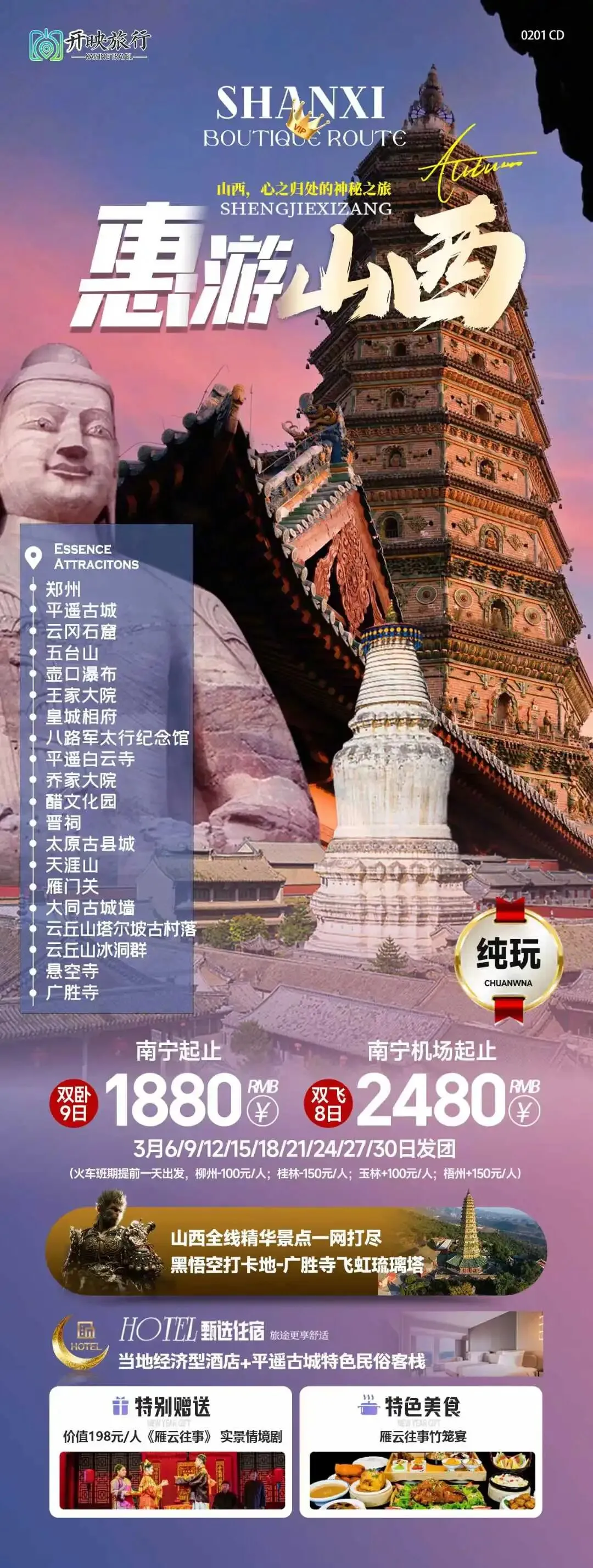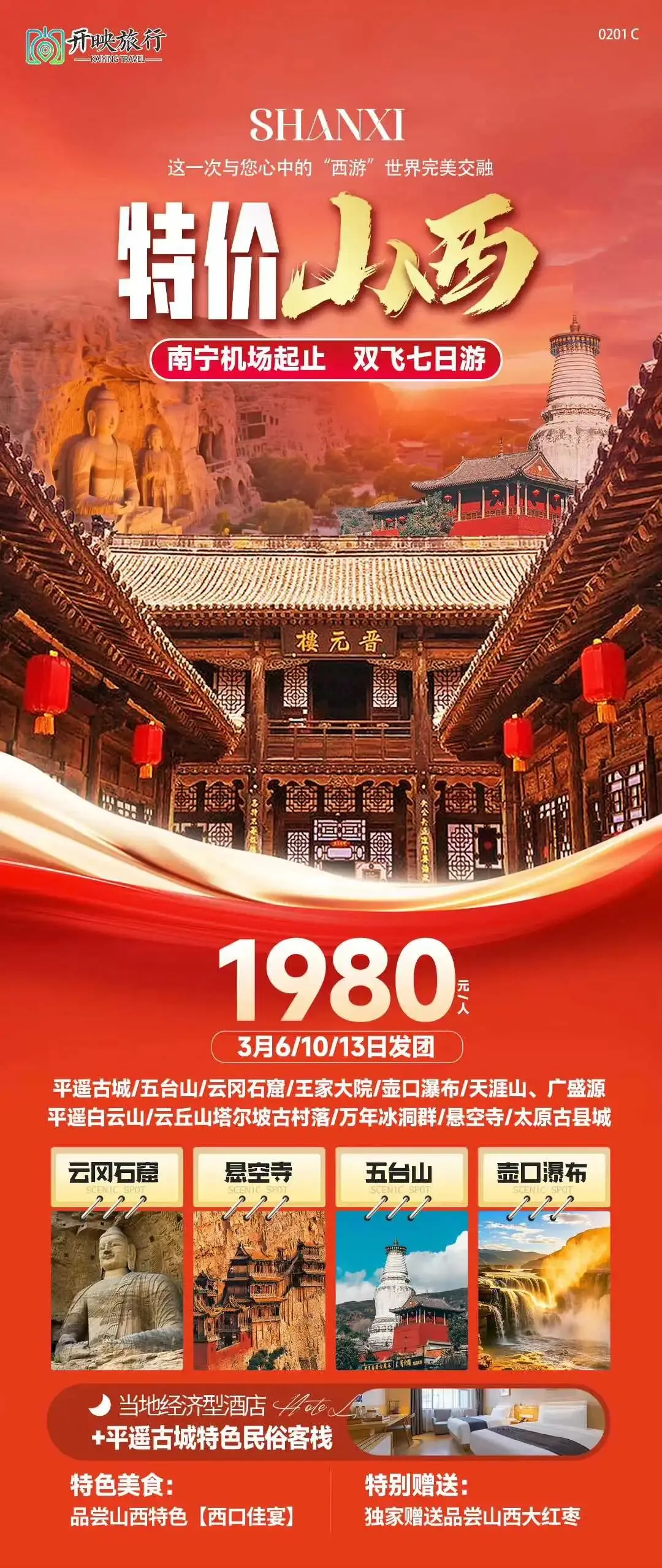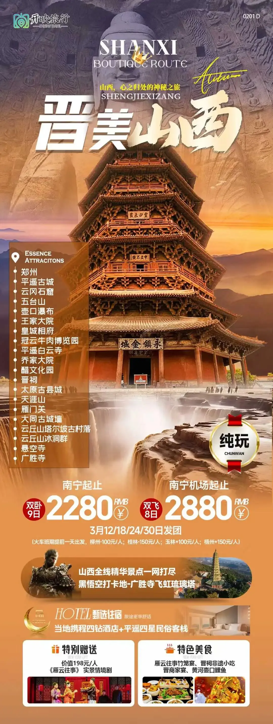 山西:3月旅游线路汇总(平遥古城◎乔家大院◎王家大院◎皇城相府◎波浪谷◎万年冰洞群◎西柏坡◎五台山◎悬空寺◎云冈石窟◎壶口飞瀑)