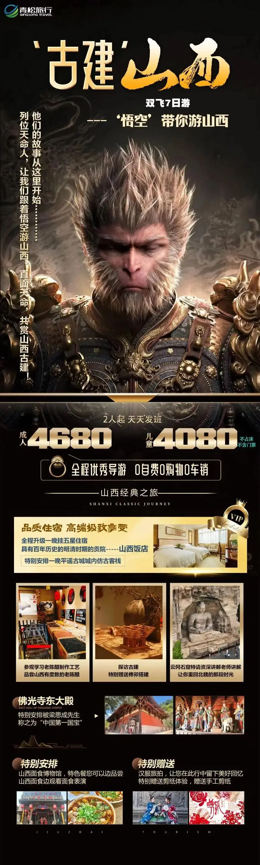 “华夏古文明,山西好风光”,山西被称为“中国古代建筑艺术博物馆”,境内保存完好的宋、金以前的地面古建筑物占全国的70%以上。古人类文化遗址、帝都古城、宝刹禅院、石窟碑碣、雕塑壁画、古塔古墓、佛道圣地、险堡关隘以及革命文物、史迹等,从北到南,构成了山西古今兼备的人文景观。