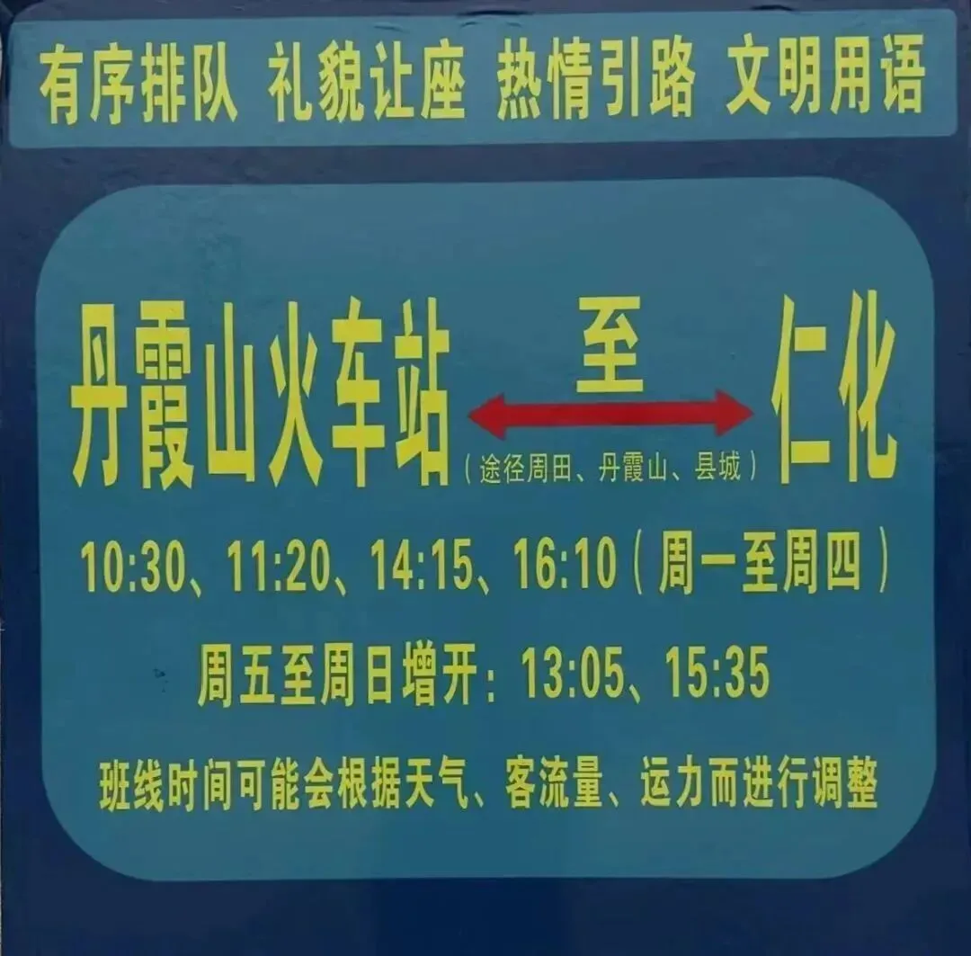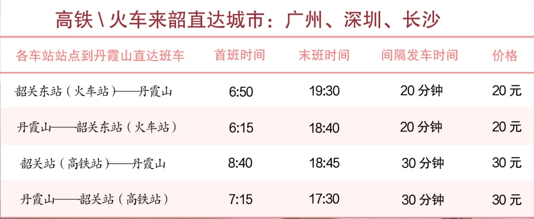 到达韶关东站后,可乘坐丹霞山专线巴士抵达景区。丹霞山专线巴士信息(汽车约60分钟)